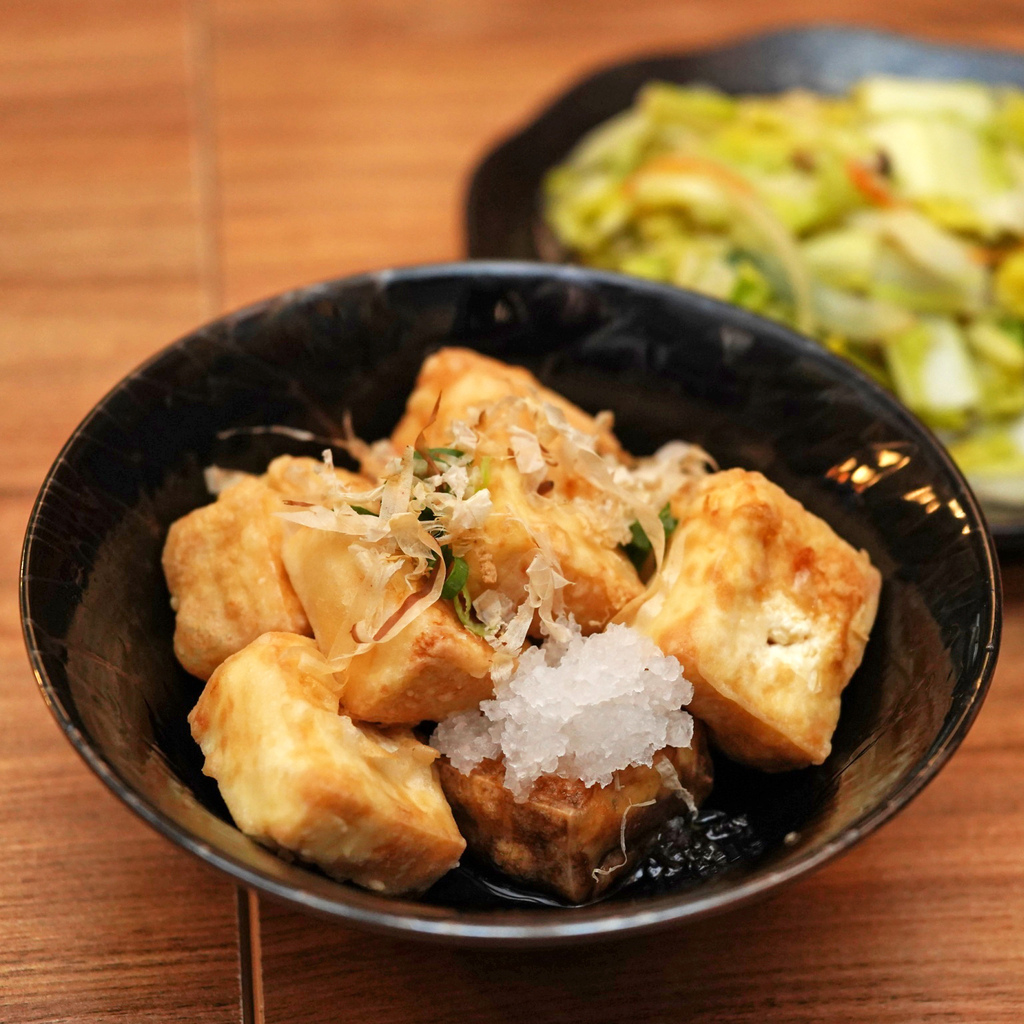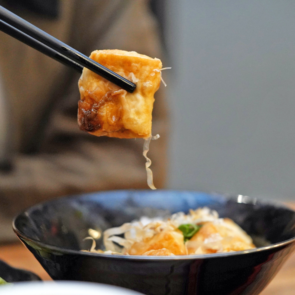 ▼外皮裹著薄薄的粉炸得金黃酥脆,內裡的豆腐則保持著軟嫩滑順。淋上鹹甜的日式醬汁,柴魚片被熱氣蒸得會跳舞,視覺上就很療癒。醬汁滲入酥皮後,外酥內嫩的口感變化很有層次感,熱熱吃很棒。