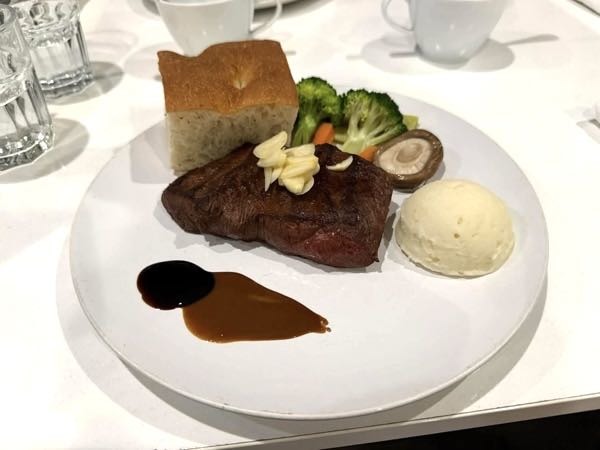薯泥的部分有驚艷到,超級滑順的口感,應該是有拌上一些奶油做處理,這樣才會香而不膩口,旁邊的佛卡夏麵包也是單純的麵包香,而且部會過油,整個麵包是鬆軟的,有別於一般排餐附上的台式餐包油膩感。因為阿明最近不吃牛排,所以交由同行的超級饕客姐姐阿月來解說,讓我們來歡迎她出場。