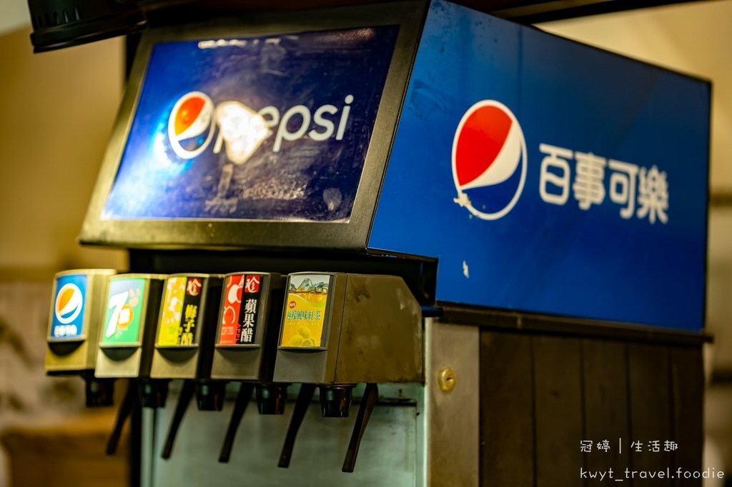 無限喝到飽氣泡類飲品、果醋機,有:百事可樂、7喜、梅子醋、蘋果醋、檸檬紅茶。