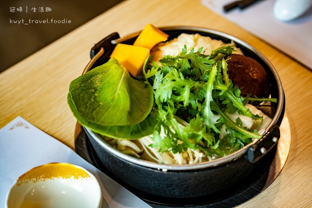 高麗菜、金針菇、山茼蒿、鴻喜菇、大白菜、青江菜、南瓜、海帶芽、玉米筍、秀珍菇、木耳,從時蔬系列食材可以感受到店內夥伴對於食材的用心、細心,清洗得相當乾淨,將其放入濃郁雞湯煮熟後,即可品嚐到吸附湯汁的鹹香,與昇華後的清甜、爽脆口感。