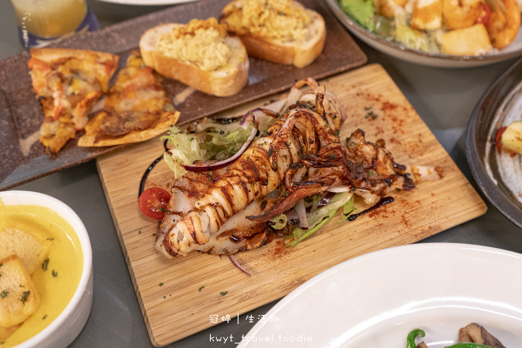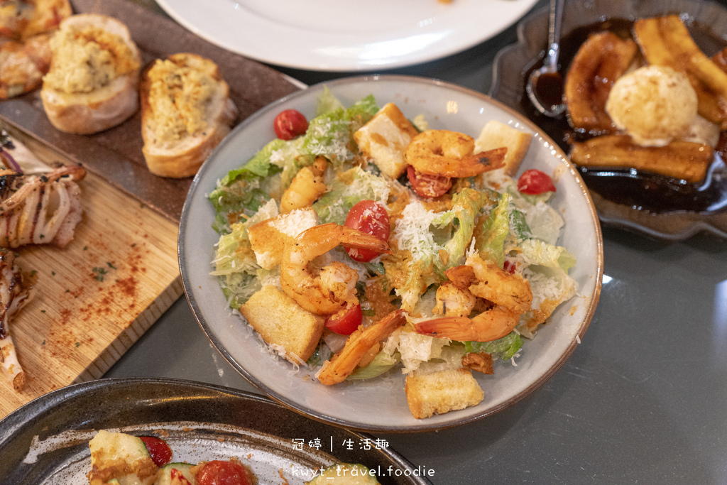 經過炭烤的鮮蝦,每一尾的大小都蠻有存在感的,巴附上迷人炭烤香氣的鮮蝦,搭配爽脆清甜的生菜、香酥可口的麵包丁一起吃,口感層次蠻豐富的。