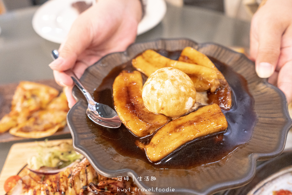 加熱烹調過的香蕉,入口的甜度大升級,搭配奶香味四溢的冰淇淋一起吃,享受冰火五重天的反差口感,甜度稍微高了一些些,搭配與鮮榨檸檬完美結合的檸檬紅茶一起享用,很搭。