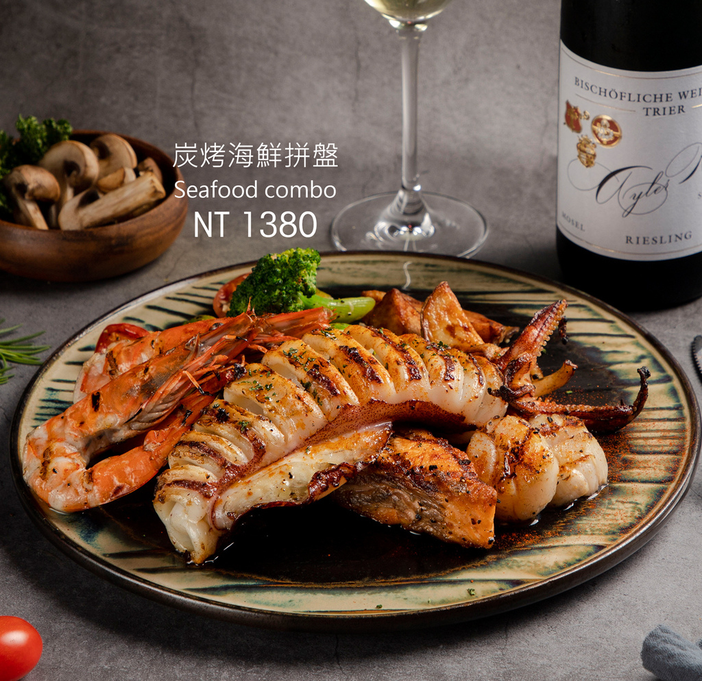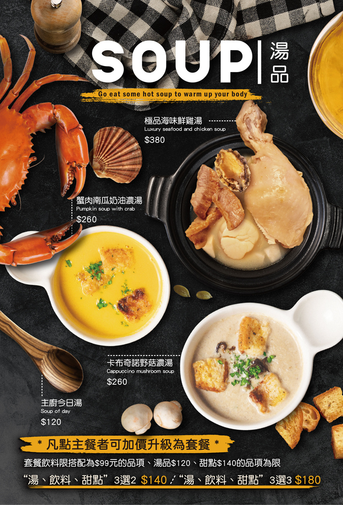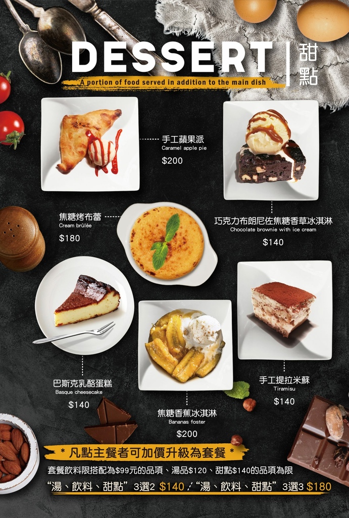 主餐可加價130元:湯、飲料、甜點三選二;或180元:升級套餐,湯、飲料、甜點三選三