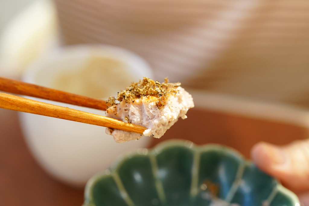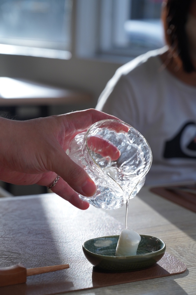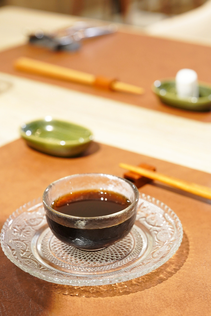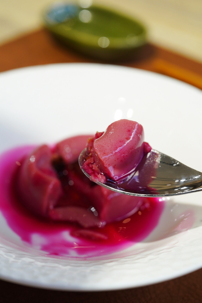 ▼甜菜根與黃豆手工製成的豆腐,口感細膩滑順,展現了食材的自然甜味。醬油昆布晶凍增添了鹹鮮提味,而阿里山現磨山葵則為注入了一絲辛香。底部甜菜根高湯溫潤且帶有甜味,完美融合了所有元素,讓人彷彿沐浴在夏日暖陽下。
