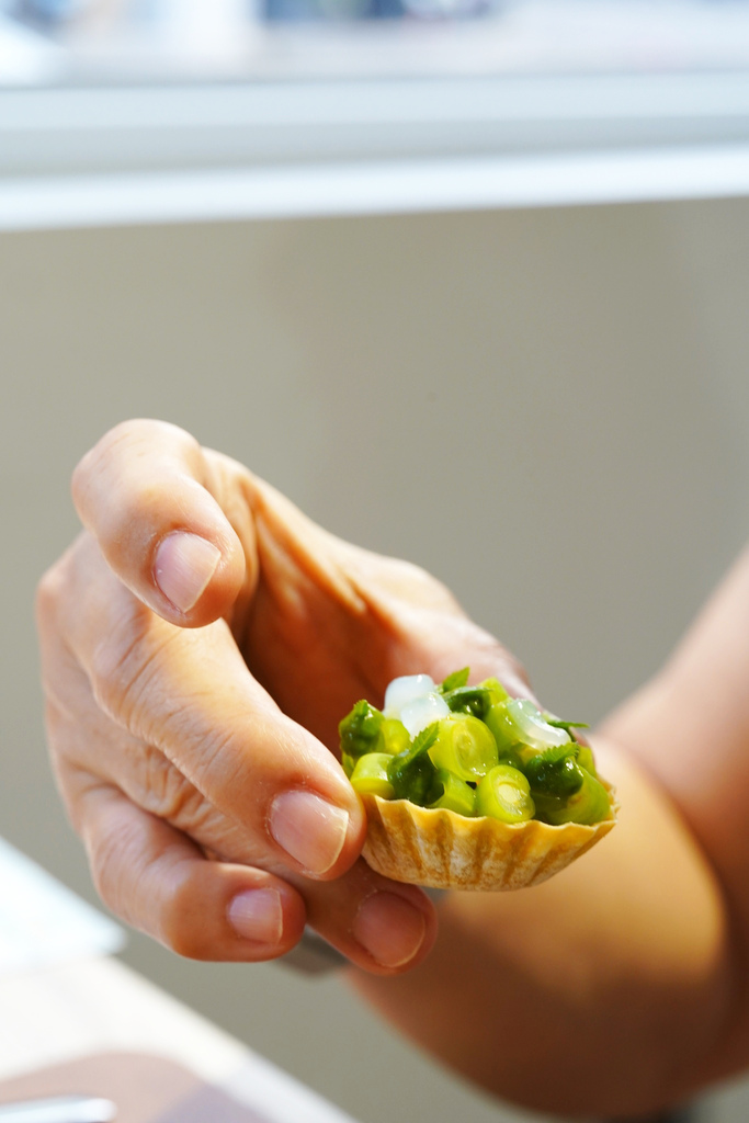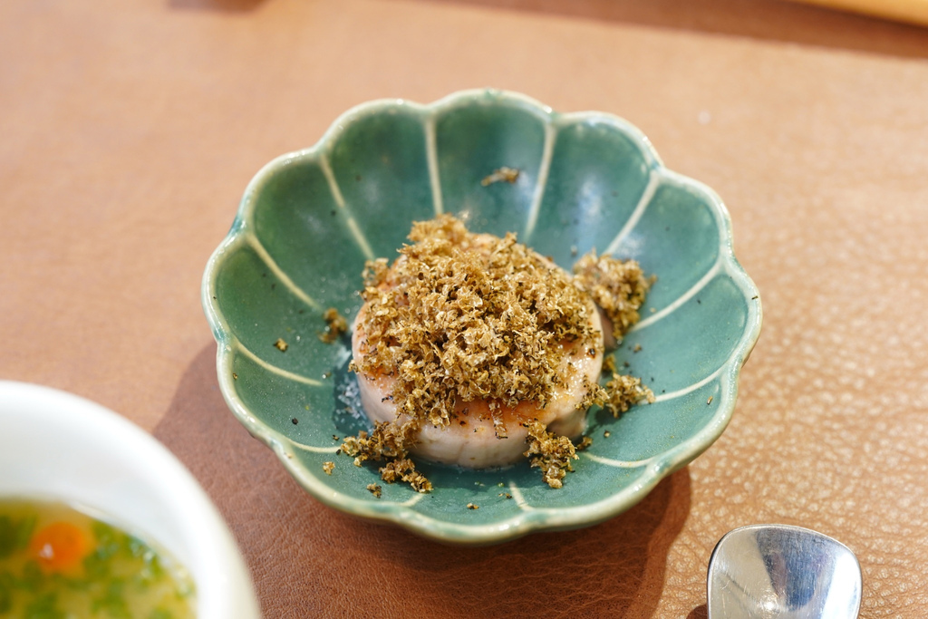 ▼以腐皮捲為靈感,越南米網紙包裹著台灣皎白筍與馬告製成的內餡,食材搭配非常巧妙,馬告獨特的香氣,為這道菜增添了不一樣的風味。醬汁以白米、菜脯、高麗菜熬煮而成,簡單鹹香中帶有微微的甜味,以綠色香菜油和香菜苗點綴其中,香菜苗的味道較成熟香菜更為柔和,增添了清爽的風味。搭配店家自己滷製的小冬菇,增添了層次感。