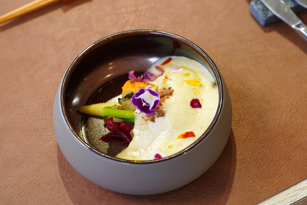 ▼以夏天有機蔬菜為基底,搭配自製的漬物而成的夏日沙拉,展現出清爽與自然的風味。新鮮玉米製成的慕斯細膩柔滑,帶有甜美的玉米香氣,而炙燒過的玉米粒則增添了一層焦香的口感,層次豐富。