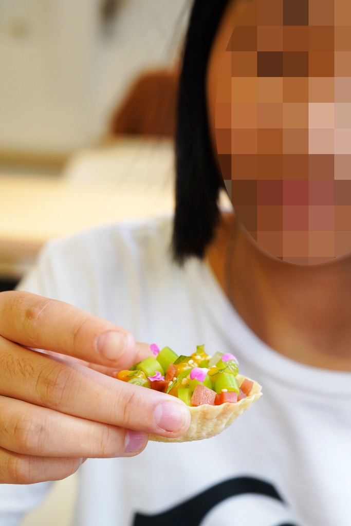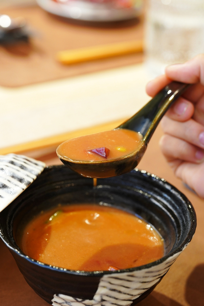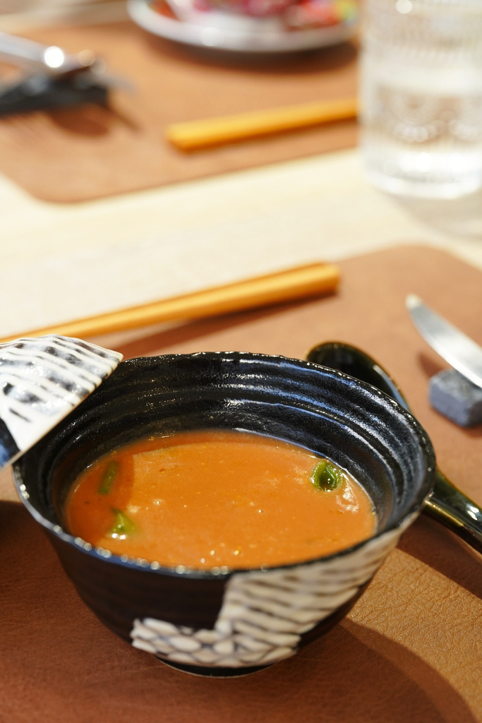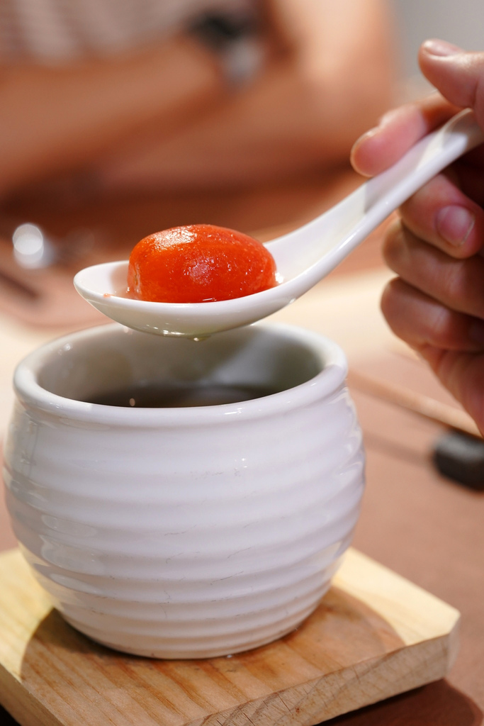 使用了夏季的香料如香茅和檸檬葉,與簡單的蔬菜相互融合,喝起來輕盈不負擔。另外要特別提醒大家,在吃去皮番茄時需小心品嚐,湯汁豐富以免爆汁XD
