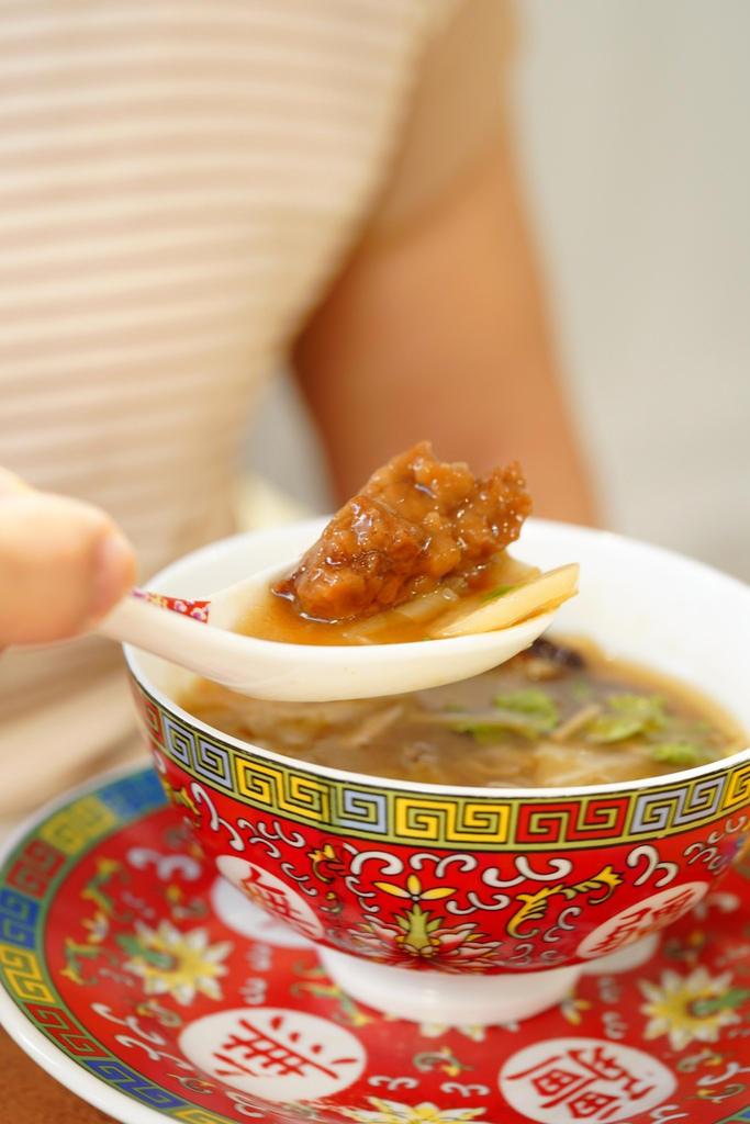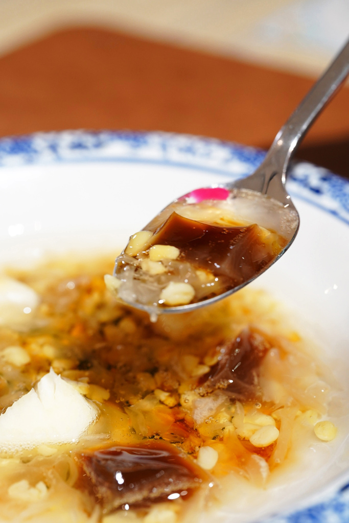 ▼非常健康的甜品,不會很甜,銀耳甜湯為主體,搭配綠豆蒜、手做黑糖粉粿、桂花黑糖蜜、鳳梨等食材,簡單攪拌一口吃進,在嘴裡的口感多采多姿!