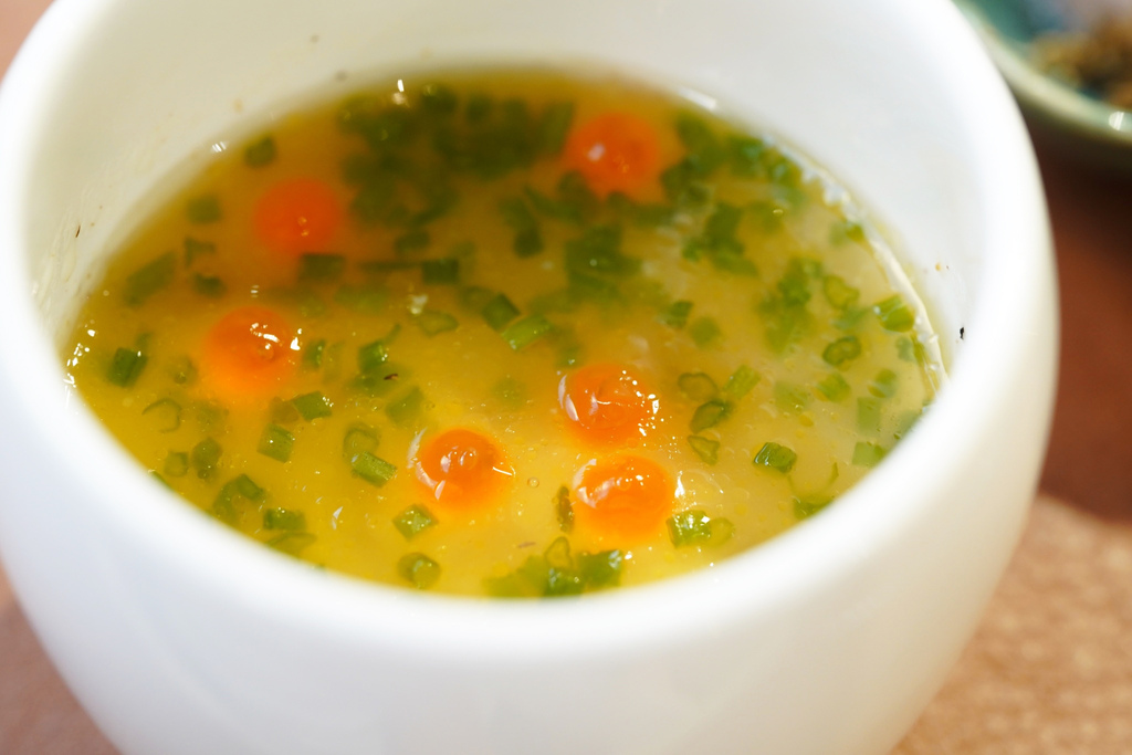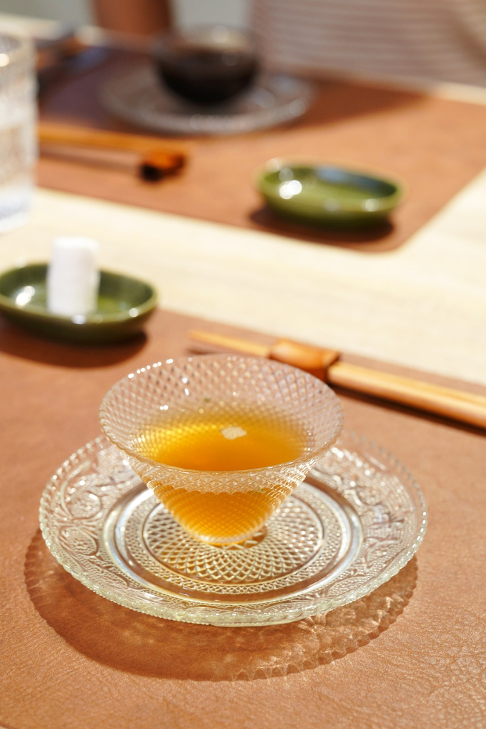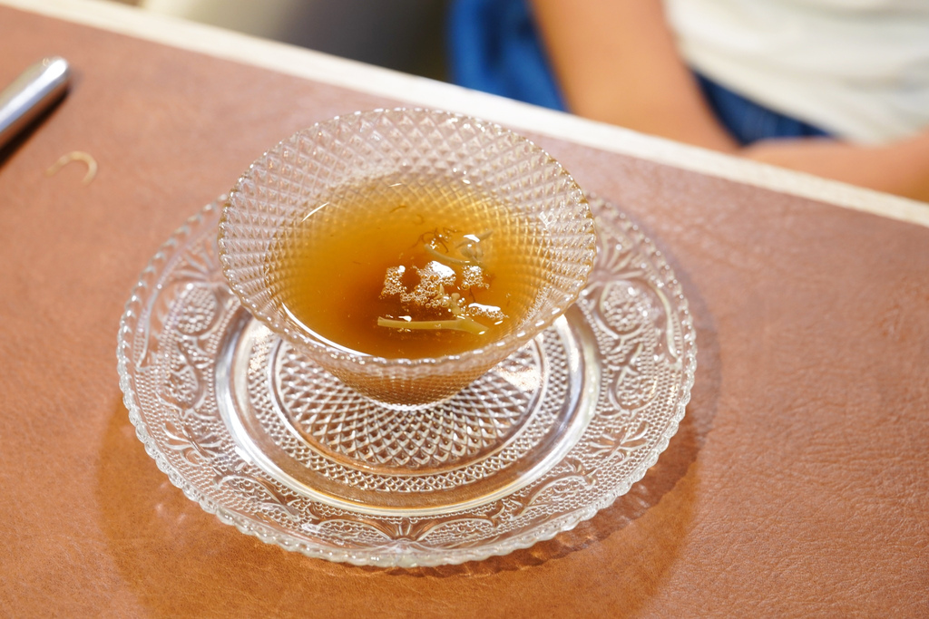 ▼這道低溫燉湯被安排在主餐後,以清爽的風味讓味蕾得到舒緩,猶如中式宴席中的清湯,在炎熱的夏天喝來格外舒適!