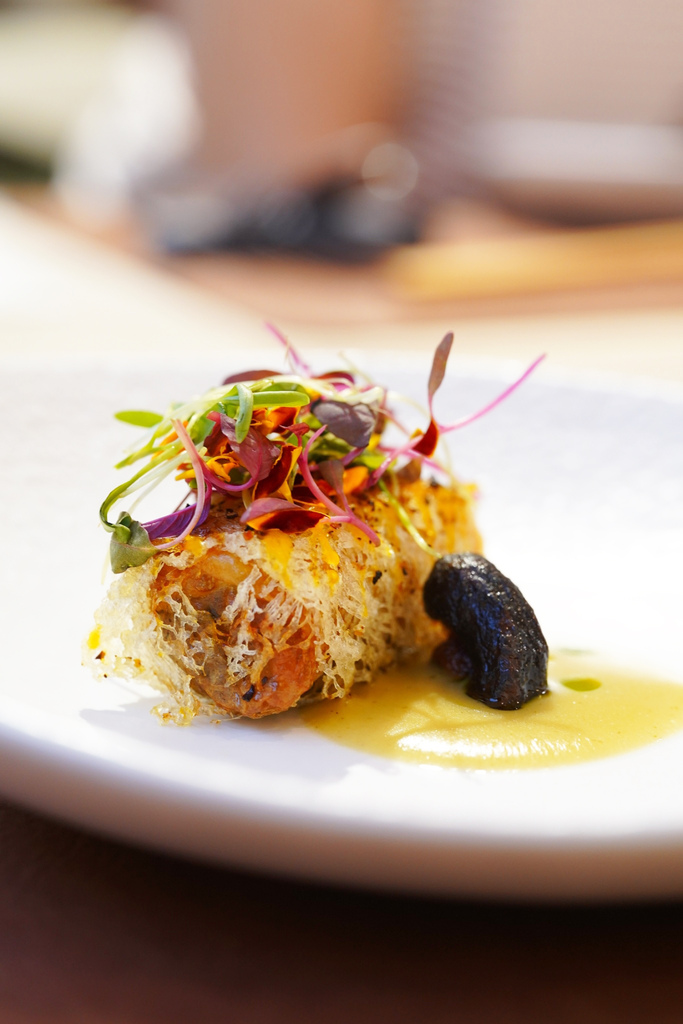 ▼這道料理充滿了主廚兒時的記憶,融合了爺爺最愛的食材。烘烤至鬆脆的日本青森縣山藥保留了皮的獨特口感,為整道菜增添了質樸的風味。搭配日本赤味噌和絹羽二重胡麻的濃郁鹹香醬料。黃色是發酵蘿蔔醬汁提供了微酸的爽口感,橘色煙燻甜椒醬汁則多了一道醇厚風味。整體既懷舊又充滿了創新,仿佛重溫了那個時代的味道。