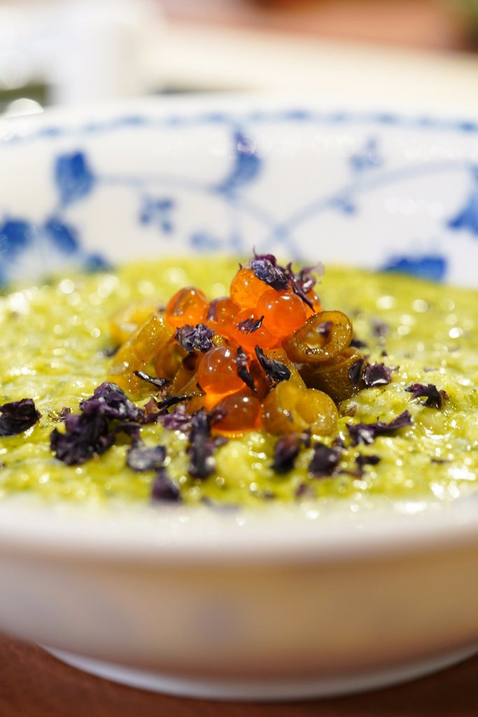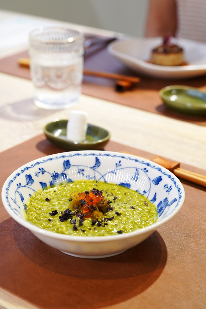 ▼燉飯以台梗九號米為基底,米心微硬,保留了絕佳的口感。醬汁則以九層塔與各種野菜如娃娃菜、青江菜等混合,呈現出多樣蔬菜風味又清新的綠色滋味。烘乾過的海藻和發酵酸缸豆拌入其中,拌一拌帶來更鮮明的豆子風味。甜椒素食鮭魚卵則為整道菜增添了色彩,也讓整體口感更加豐富。