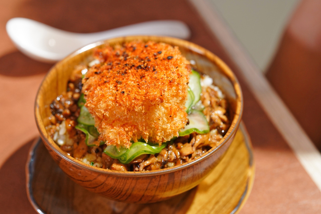 ▼令人驚艷的素食肉燥飯!視覺上非常吸引人,選用的食材也非常講究,猴頭菇和南投武界的乾香菇的搭配,讓素肉燥的口感更富有層次。搭配台梗九號米和些許糙米,不僅吃得飽足,還攝取了豐富的纖維質。醃黃瓜的清爽解膩,以及半熟炸靈芝蛋,鮮甜、沒有絲毫腥味,好適合戳破用蛋汁混著米飯吃!