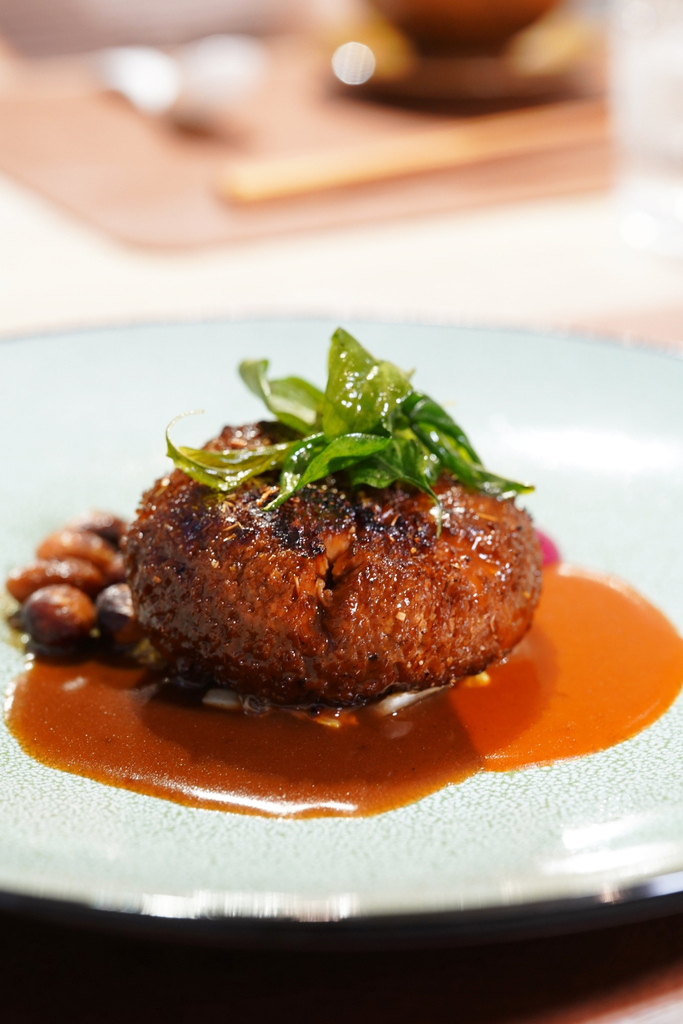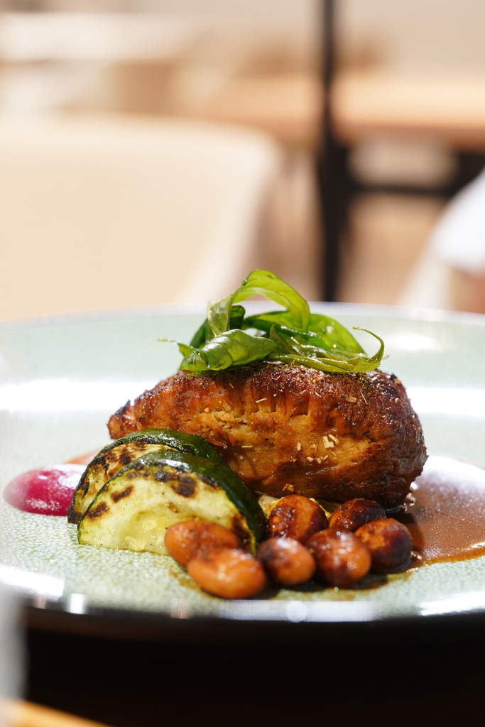 ▼將東南亞風味巧妙融合,炭烤猴頭菇吸收了香茅的香氣,帶來獨特的炭烤風味,搭配泰式紅咖哩醬汁辛香撲鼻;山當歸蔬菜醬汁增添了草本清香,平衡了咖哩的濃郁味道。當季炭烤虎豆的香甜,奶油櫛瓜的奶香多汁,整體口感更加豐富飽滿。