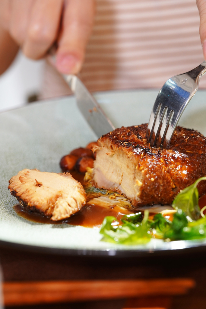 ▼彷彿將我們帶到了陽光普照的南法!迷迭香炭烤猴頭菇的香氣迷人,搭配底層濃郁的普羅旺斯燉菜,每一口都充滿了層次感。燉菜中大量蔬菜的鮮甜滋味與番茄的酸甜味道完美融合,再搭配上新鮮蔬菜的爽脆口感,整體口味清爽不油膩,讓人吃完感到身心舒暢!