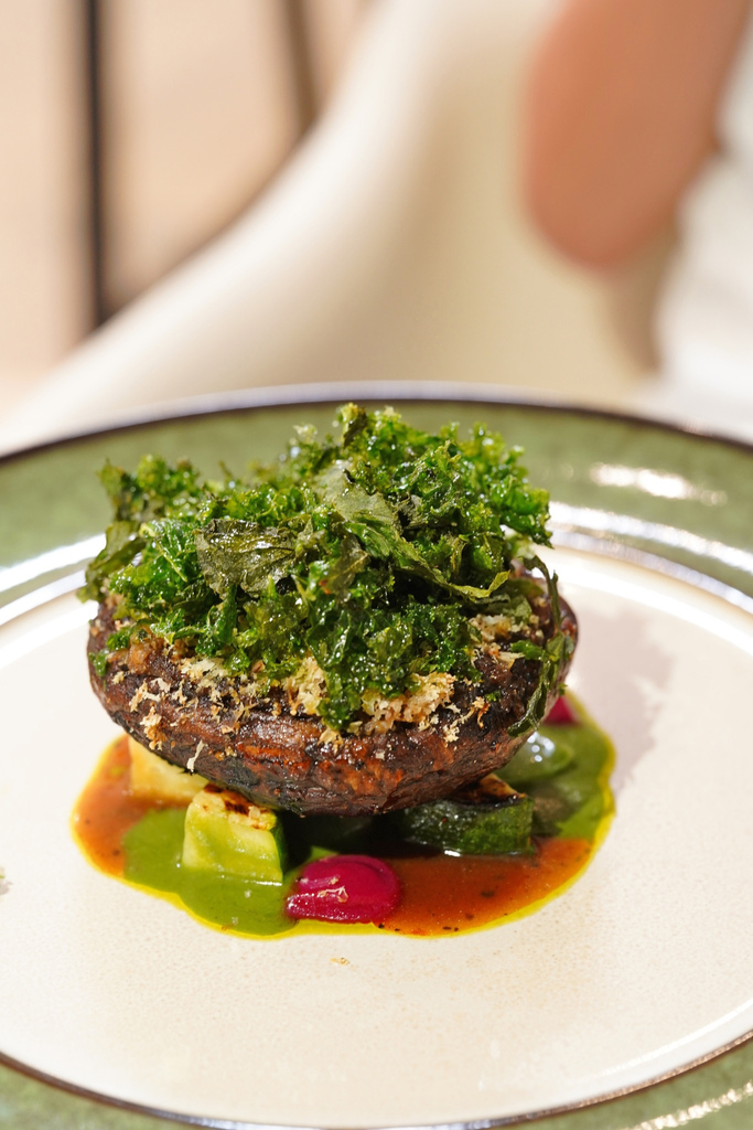▼這道是全素主餐,以整顆炭烤波特菇為主角,鑲入濃郁的蕈菇泥,由多種菇類與薏仁、栗子精心調製,最後以山當歸和羽衣甘藍鋪蓋其上,層次分明。底部醬汁,一個是綠色叢林醬由三種野菜調製,一個是咖啡色醬汁則是由台灣馬告和蔬菜熬煮而成,風味濃厚。