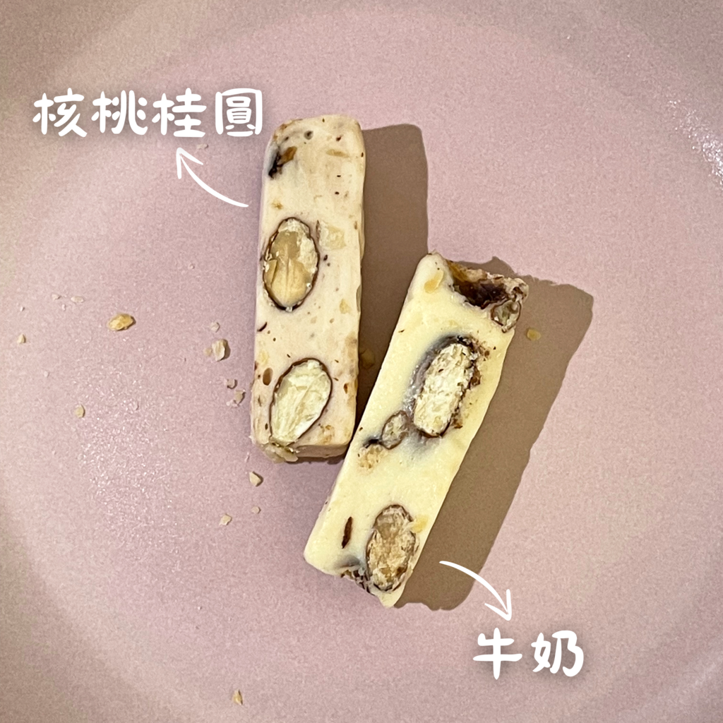 ▼核桃桂圓牛軋糖有更多堅果的口感,大顆的花生、細顆粒的核桃,咀嚼時還有龍眼肉的香和甜,整體吃起來滿有養生感。