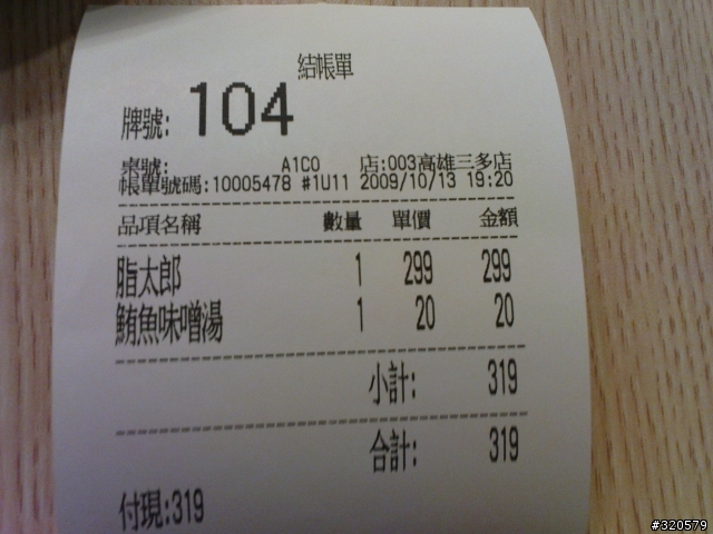 昨天去吃了 有圖有真相直接上感想味增湯 :$20 ,可無限續碗味道:可但是味精味道有點重......手捲:各nt$20推薦 左邊的蔥鮪魚手捲 ,nt$20......去哪裡找阿照燒蔥鮪: nt$90 (兩串)魚肉很大塊 味道有點吃不進去但是價格還是便宜.....左上角 綜合生魚片(小):nt$100 !有推~~~~生魚片的口感跟在高級料理店吃的一樣左下角 綜合壽司 :nt$120由於已經有點了生魚片 所以就沒有再點生魚握壽司了味道普通 份量足右邊的是壽司飯 nt$120味道有點偏台式 醋飯味道太甜而且所有飯類都太黏了 應該是中央廚房煮出來就水分太多加上到現場用機器壓製 ......結語;只要把他想成是 鮪魚界的麥當勞就是了店裡面很多東西都是直接用像超市買的那種盒子直接就送上餐桌 而且上面還有barcode .....適合上班族中午定便當的店或是晚餐想多點變化的家庭