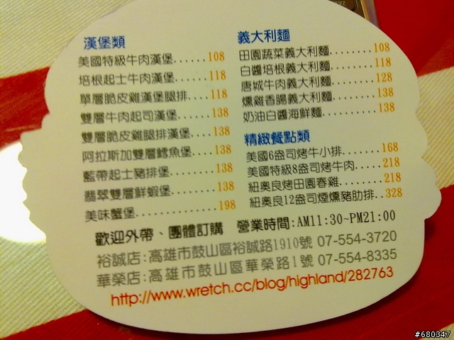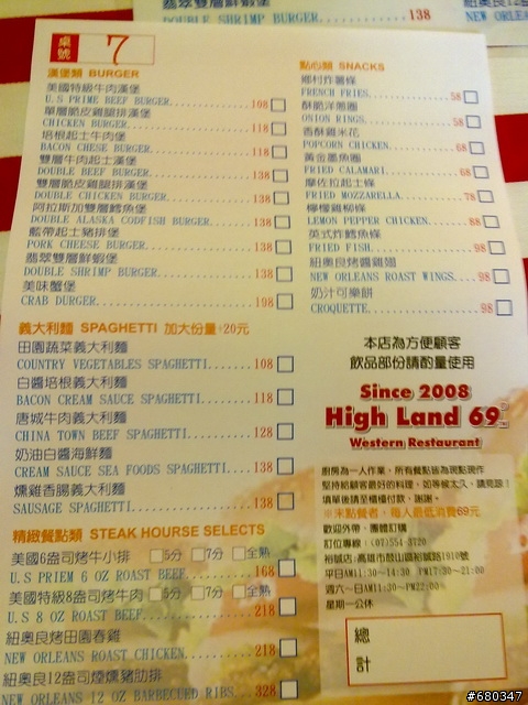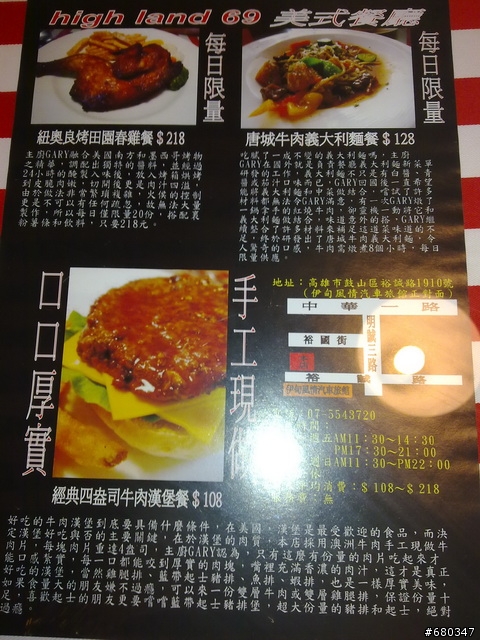 High Land 69 [MilkTang吃吃之旅]今天跟朋友去朋友介紹的這間吃看看整個還滿美式的感覺生意還滿不錯的~~都要等~~不過位子本身也不多啦~~只有一層樓~~它的飲料是無限喝的這間感覺就跟吐司先生差不多看圖吧~不過這手機拍的= ="這是店的門口菜單嗯嗯....櫃台環境1環境2雙層牛肉起司漢堡1雙層牛肉起司漢堡2美國特級8盎司烤牛肉1美國特級8盎司烤牛肉2店家名片店家名片整體上都還滿不錯的~~下次要吃看看美味蟹堡注意!!! 星期一公休喔= =