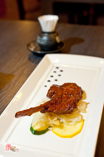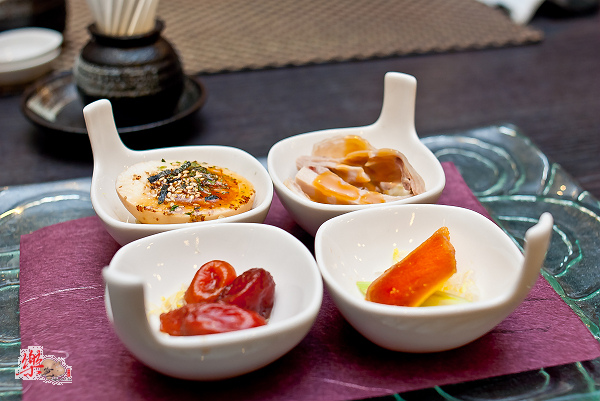 第一道菜名為"和漢引味四寶碟",(如上圖), 當中由左起依序是溫泉蛋、土雞肉、烏魚子以及紅酒番茄。筆者喜歡紅酒番茄, 很開胃, 其他的小菜也很精緻很不錯。