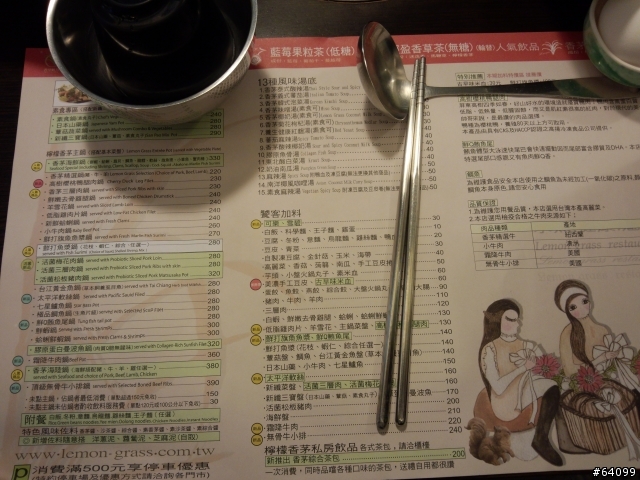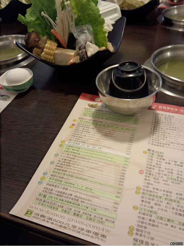 這邊可以共鍋,不過有低消、飲料服務費限制,一般是檸檬香茅搭配基本菜盤;附餐有:白飯、王子/烏龍/雞絲/意麵和冬粉可以選擇。主鍋的種類很多,價格在 $220~$390 之間,另外也有提供十多種湯底可以加價更換。
