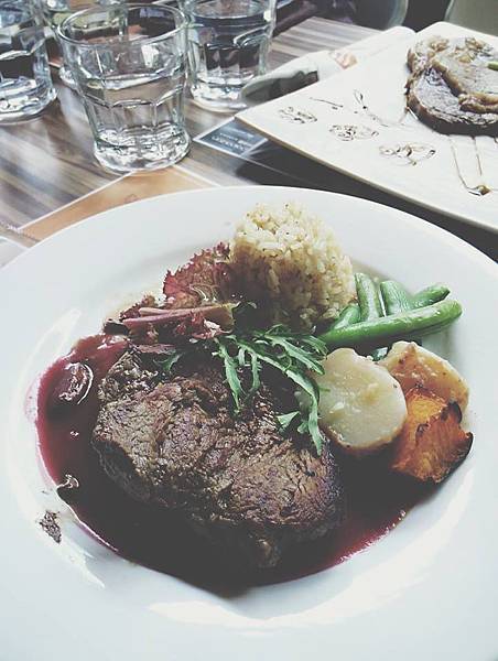 五分熟的熟度鎖住飽滿肉汁,呈現最迷人的色澤,但個人覺得這塊菲力牛排屬於有點嚼勁的口感,但不會到太難咬,搭配法式甜蒜紅酒醬超級搭! 法式甜蒜紅酒醬更能把菲力牛排的肉香帶出來,真是塊香氣、多汁、口感兼具的牛排阿,通常排餐旁邊的配菜都會很亂來,不過旁邊的不管是香料米飯還是蔬菜都好好吃,那個豆子每個都好肥嫩飽滿清脆多汁,不過我的南瓜烤的有點乾就是了。