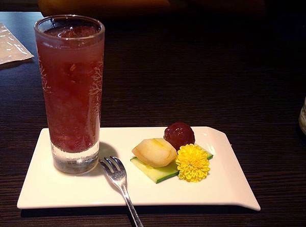 接著是讓我們等了快半小時才上來的甜點 中間店員有跟我們說甜點要比較久讓我們稍有期待,只是沒想到上來的竟然只是這小小的紅酒醋凍加上兩顆醃水果,我跟朋友就想說疑?這需要那麼久嗎??