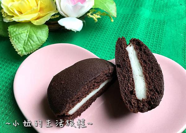 日本超人氣夢幻甜點的屋比派有點像是大尺寸的馬卡龍造型,外層是巧克力蛋糕,裏頭夾著的是軟綿的棉花糖,棉花糖比較濕潤,吃起來綿密又香甜,讓人一口接一口停不下來