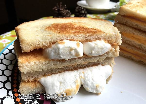 棉花糖熱情的吐舌頭,三明治吃起來綿密又香甜,外層有酥酥的糖霜口感,真好吃~沒想到花生醬和棉花糖這麼搭配