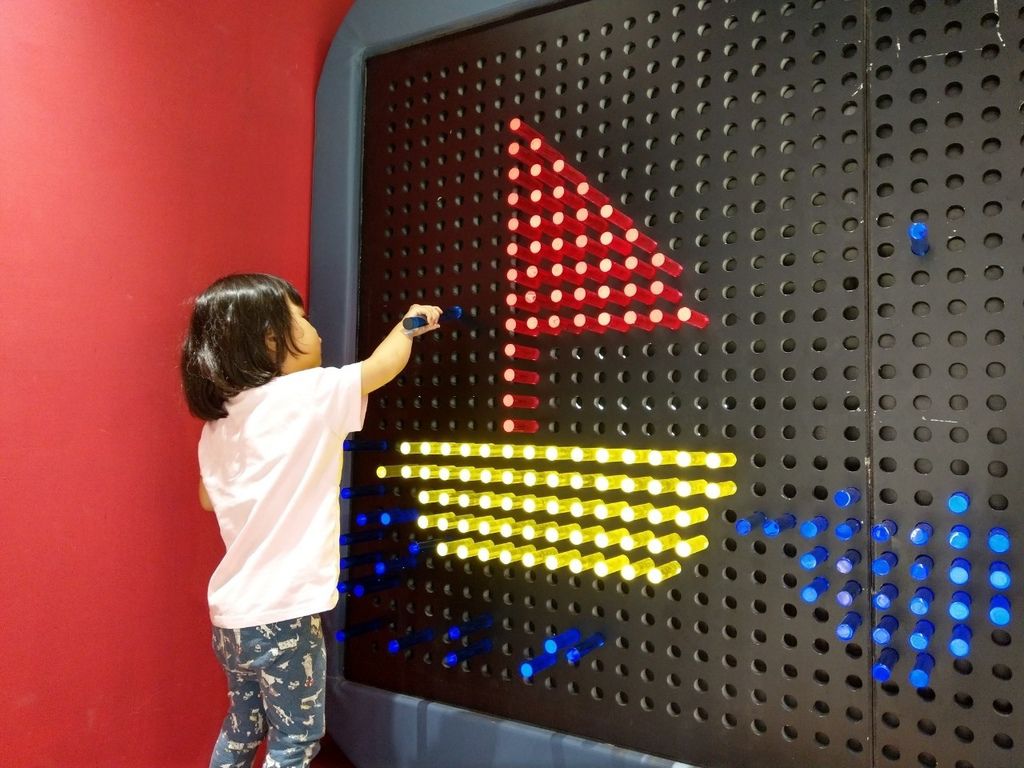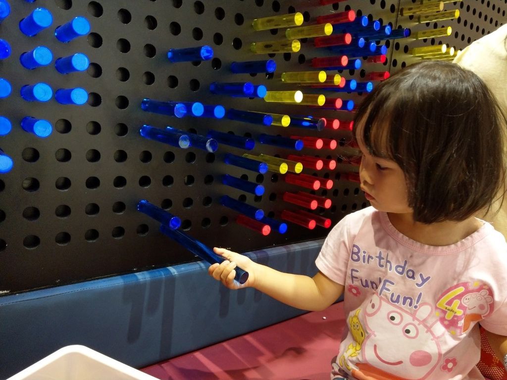 壓克力條透過背板燈光的折射,將自身的色彩散發成極大值。小朋友可以透過色彩的拼湊,將基礎的線條構成一幅美麗的畫。而多多愛看佩佩豬,要求媽咪一起合作狗船長的帆船。(呼~~好險沒有挑很難的圖案,媽媽真的沒有美術細胞)
