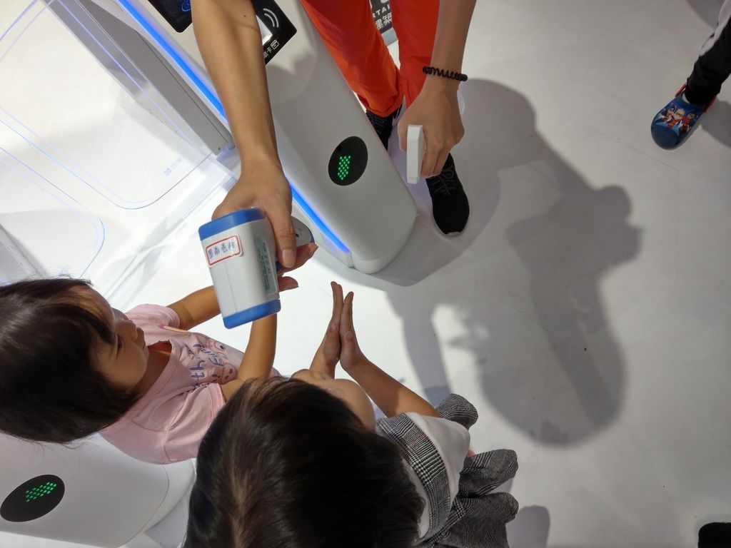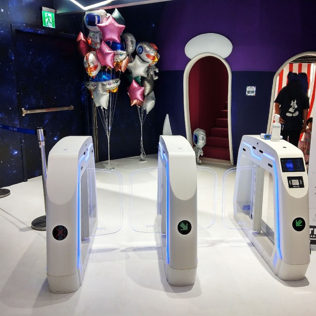 為了維護館內的衛生,進閘門前需要以酒精來進行手部消毒及感測體溫。