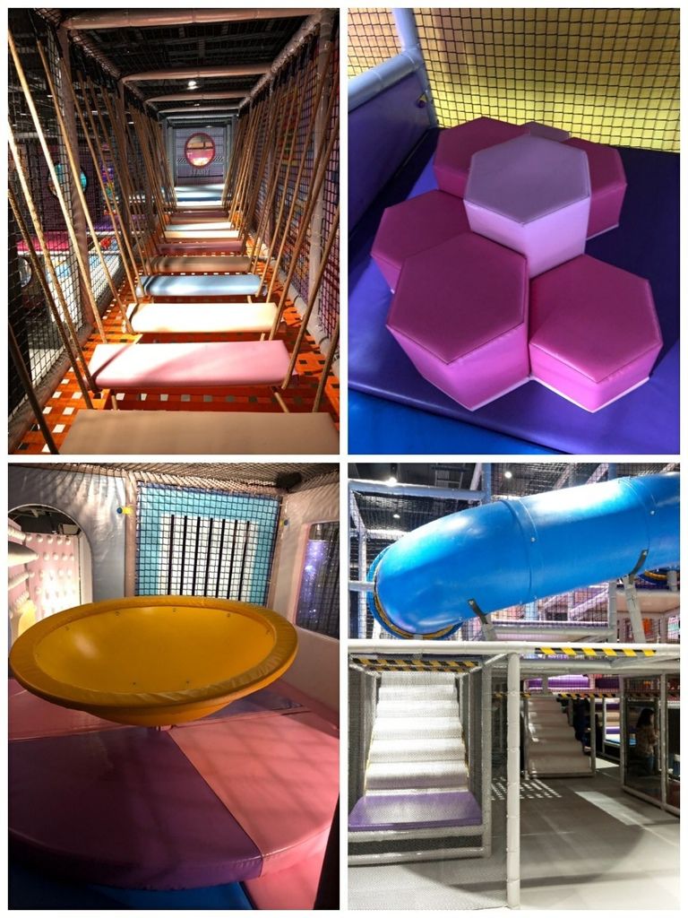 一樓空間有mama baby(哺乳室)、 星光互動區、益智積木區、星河砂區、光影實驗室、躍躍衛星跳跳區、UFO基地站、綜合拓展區、騎行競速區與家長舒壓/休息區。二樓空間有銀星泡泡池、生活街區、豪華公主美妝區及知識補給站。一連串密密麻麻的區域,就知道這裡有許多不同的遊樂設施,給小朋友身心靈大大滿足。