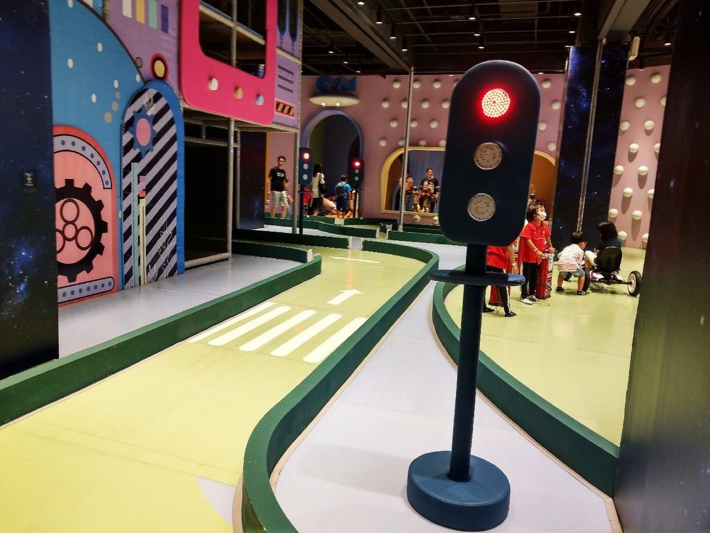 每個小孩心中都有賽車夢,而在這區域一圓夢想,雖說設有加油站,但汽車的動力是來自小朋友的雙腳,在這裡必須雙腳協調的踩踏才能前進。但小小孩的家長(就是我)也不用放棄這個區域,當小孩無法踩踏前進時,這高聳的椅子可是很好使力,輕鬆幫助小孩往前走。