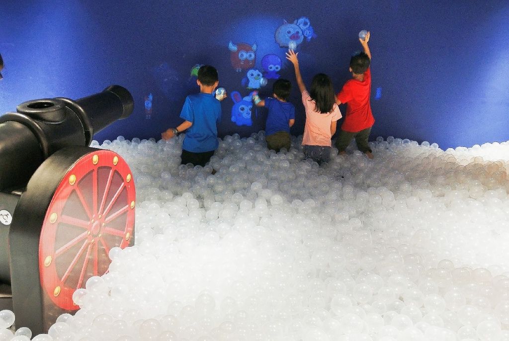 除了一樓的UFO基地外,二樓也是有一個銀星泡泡池。牆壁上有互動投影遊戲,藉由丟球的遊戲可以強化小朋友的手臂肌力。如果丟累了,那還可以利用加農砲小小偷懶,就讓我們一起對抗外星人吧。