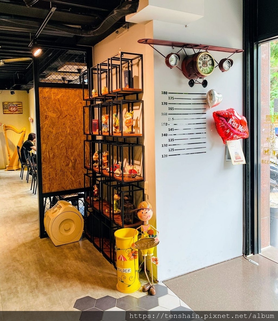 門口右側牆面上畫有身高量尺,不知有何用途?難道是點兒童餐有身高的限制嗎?鐵架上展示一些可愛的陶偶。我特別注意到地上擺放一台 Honeywell 空氣清淨機,雖然對於這麼大的空間,一台空氣清淨機能達到多少淨化空氣的效果存疑,不過,店家有心讓客人呼吸更乾淨的空氣,還是值得鼓勵。