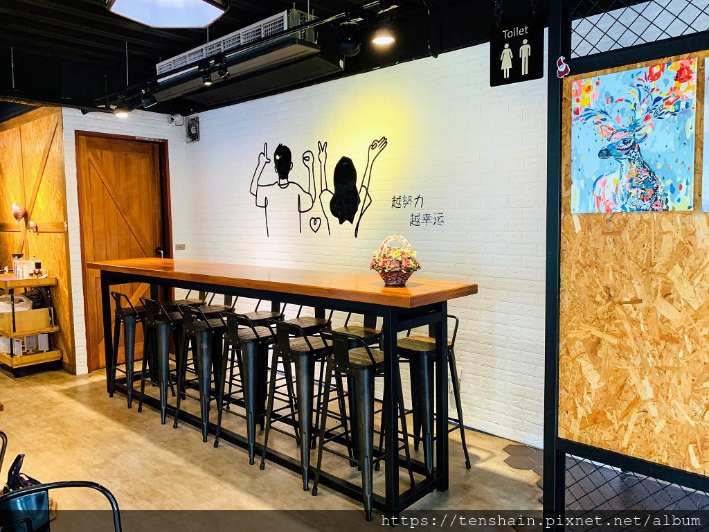 店裡也有類似吧台的高腳椅座位,牆上簡單的素描,卻有令人深思的寓意。