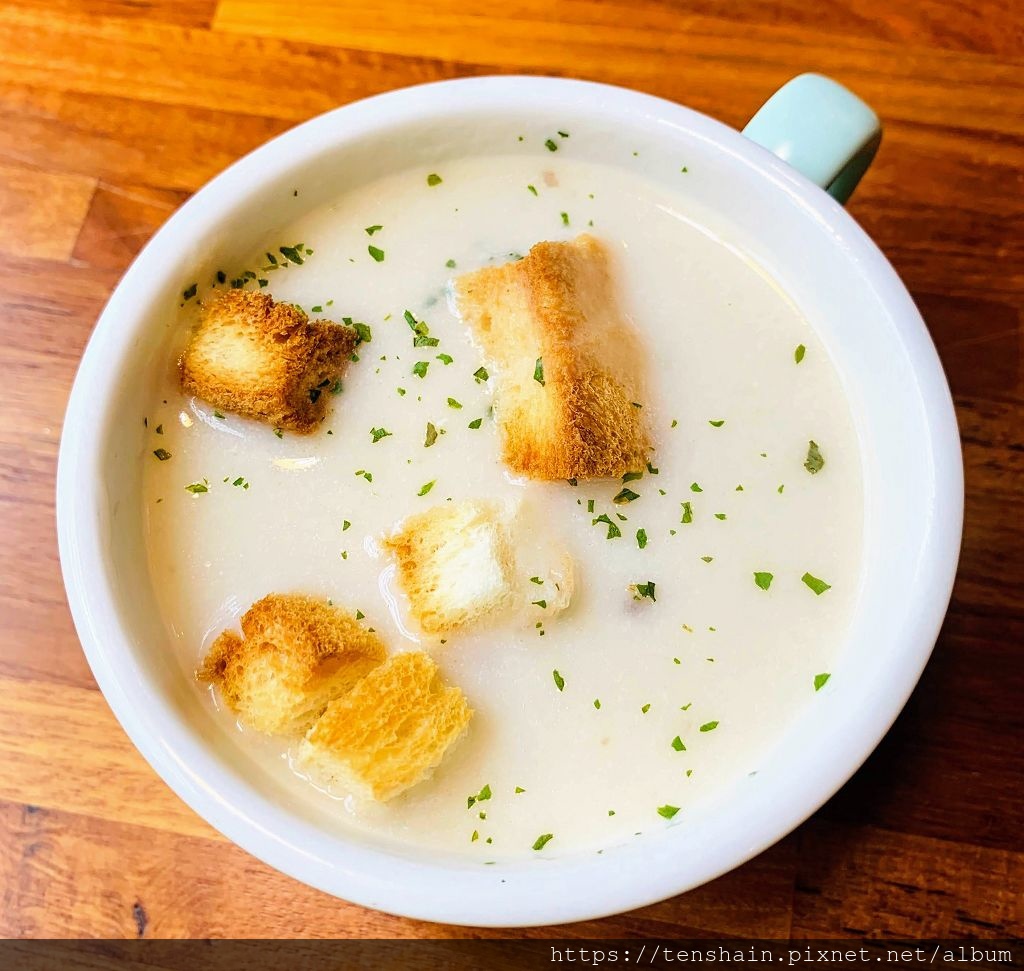 今天的湯品是玉米濃湯,奶味特別香,但麵包丁不討我們喜歡,不軟不脆,也不夠味。