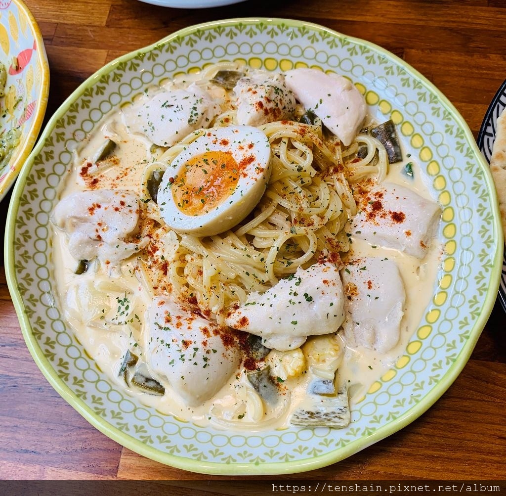 奶油剝皮辣椒雞義大利麵的剝皮辣椒還是有一點辣度,雞肉看起來白白的,吃起來卻蠻有味道的,也夠軟嫩。麵體沾滿白醬,滋味自然好吃。