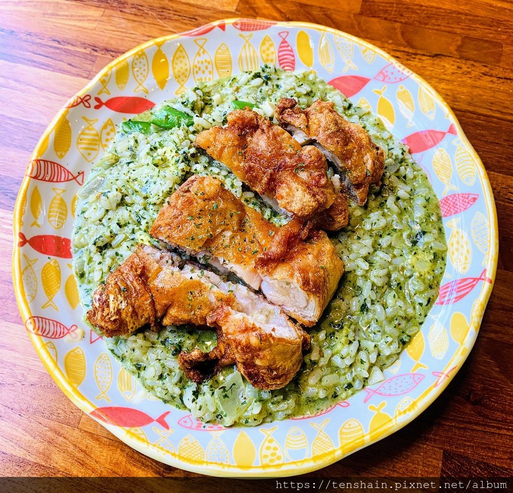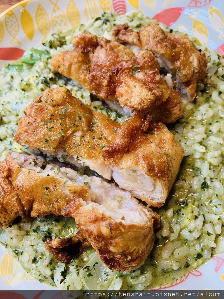 聽說這家的雞腿排很受歡迎,果然不錯。酥脆的雞皮裡,包裹的是軟嫩的肉質。吃起來雞肉的鮮味源源不絕,毫不油膩,也沒有多餘的脂肪,真的好吃。燉飯的米心是義大利燉飯的特色,不會過硬,卻多了一分咀嚼的樂趣,讓甘美的滋味停留在口腔中更久的時間。青醬的羅勒味恰到好處,不會過野,均勻分布在所有燉飯之間,每一口都芬芳。