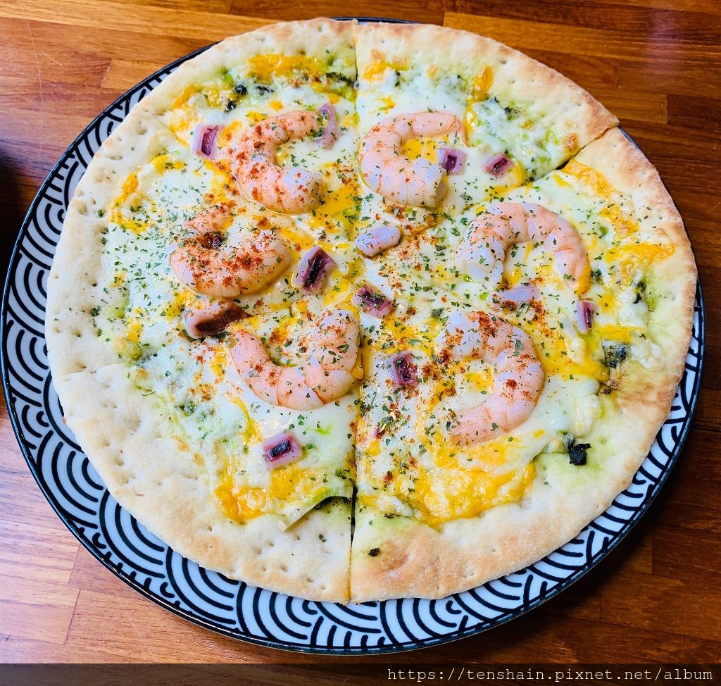 相對於青醬雞腿排燉飯的滿意,青醬海鮮披薩就完全讓我們失望了。正統義大利披薩的特色就是醬汁很豐富,薄而脆,邊上微微隆起,吃起來像餅乾一樣香脆。以這樣的標準來看,這個青醬海鮮披薩完全不及格。餅皮吃起來軟軟、粉粉的,像麵包多過於像餅乾。蝦子看起來不錯,吃起來卻沒有鮮蝦的鮮味,大女兒一片都吃不完,老婆也只吃了一片就放棄,結果這道淪為最後勉強吃完的餐點。