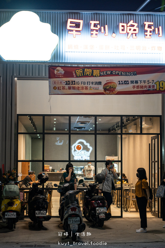 位於高雄市左營區新勝街81-1號的早到晚到左營巨蛋店,從捷運巨蛋站5號出口,步行7分鐘左右即可看到店門口;騎車的朋友們可將機車停放門口,蠻方便的。