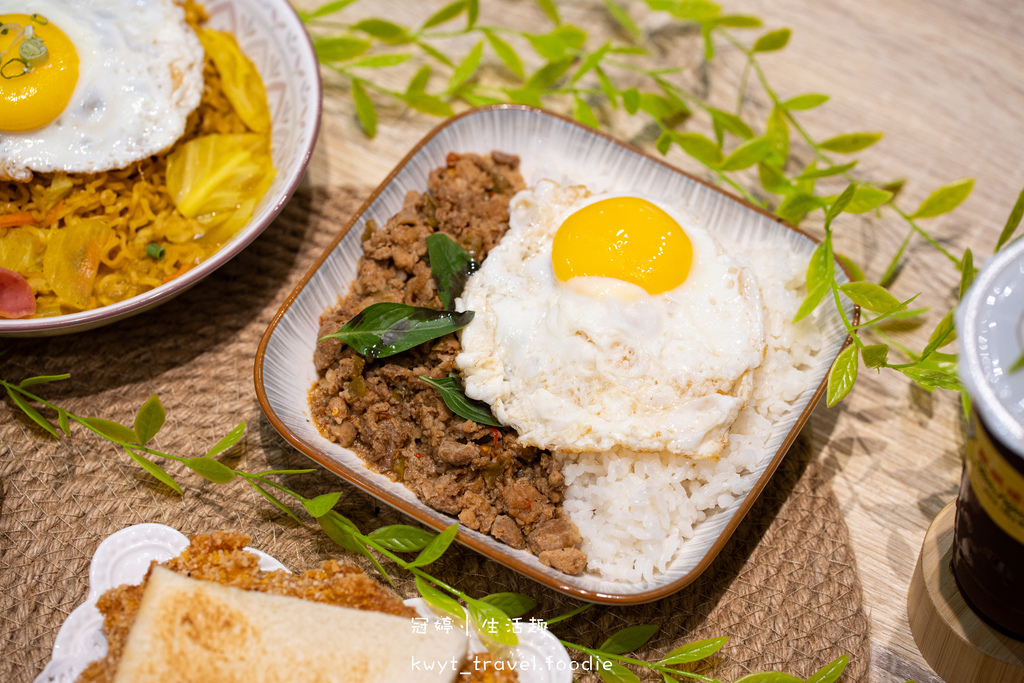 以嚴選的台灣豬絞肉,搭配經典打拋醬炒製,呈現帶有微辣口感,細細品味可以嚐到豬絞肉的鮮香、九層塔的清香、辣椒的辛香完美結合出有層次感的香氣,搭配讓人看著很有食慾的半熟蛋,還有香、Q、甜白米飯,即使過了晚餐時間的深夜也吃得到一份充滿溫暖的飯食。