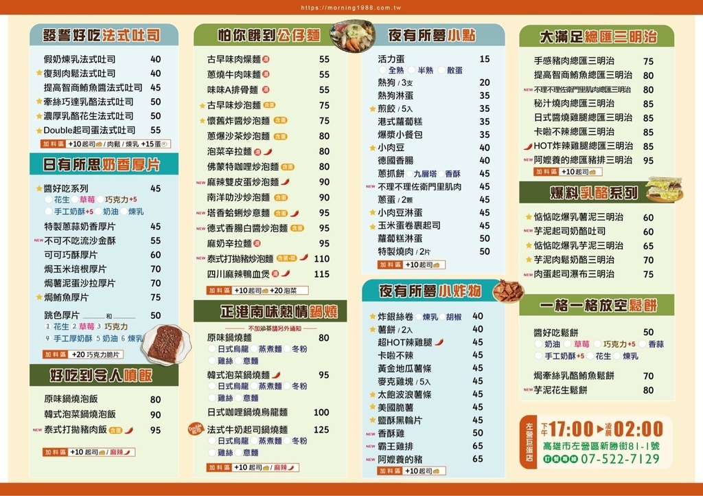 左營宵夜推薦-早到晚到左營巨蛋店菜單 (來源:早到晚到左營巨蛋店FB粉絲頁,2022.11)
