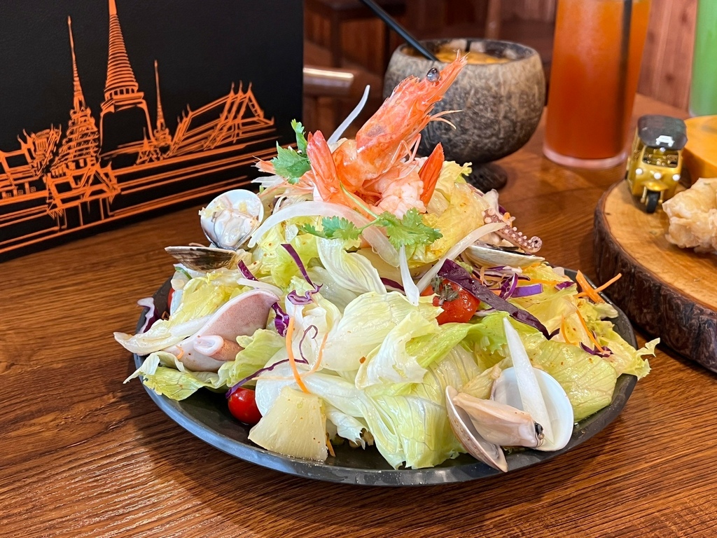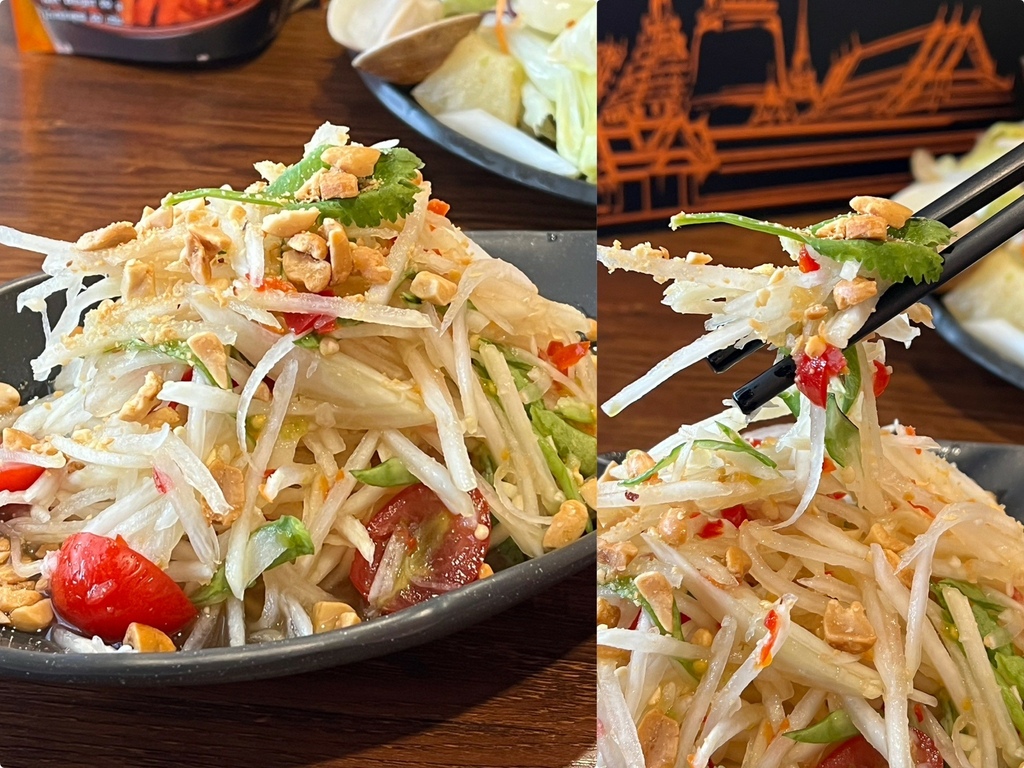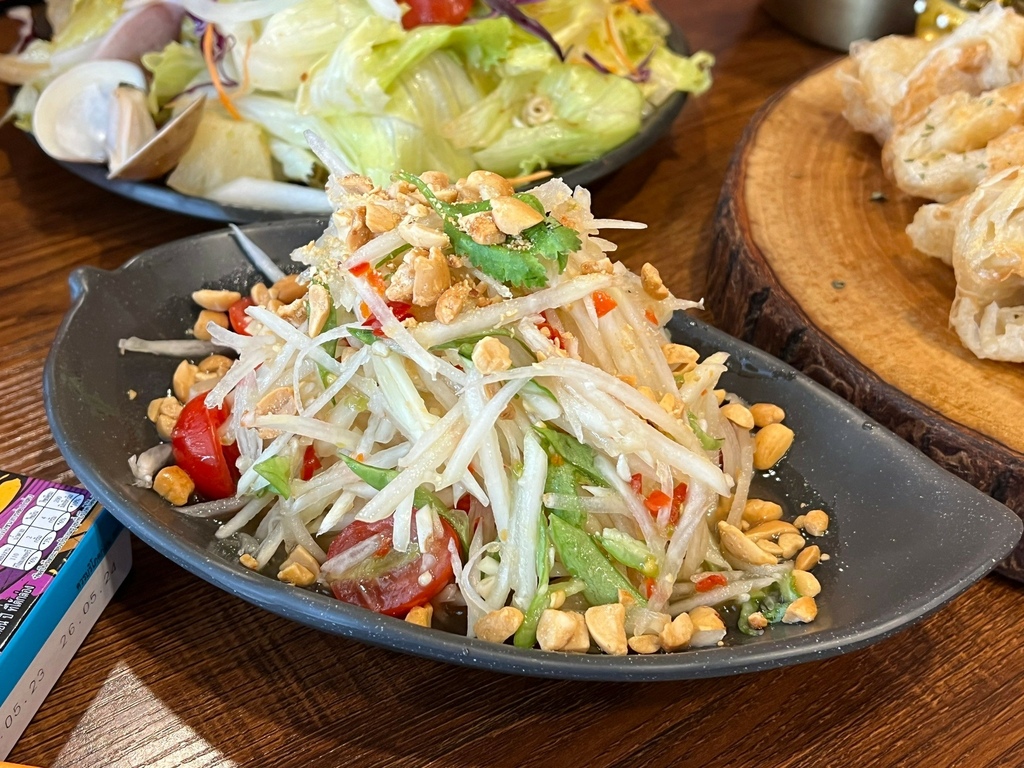 一入口就卡滋卡滋爽脆聲響個不停,新鮮爽口的木瓜絲,不僅消暑退火,也能提振食慾,上頭加入很多新鮮的泰國香料,忠實地還原泰國正統的家常料理