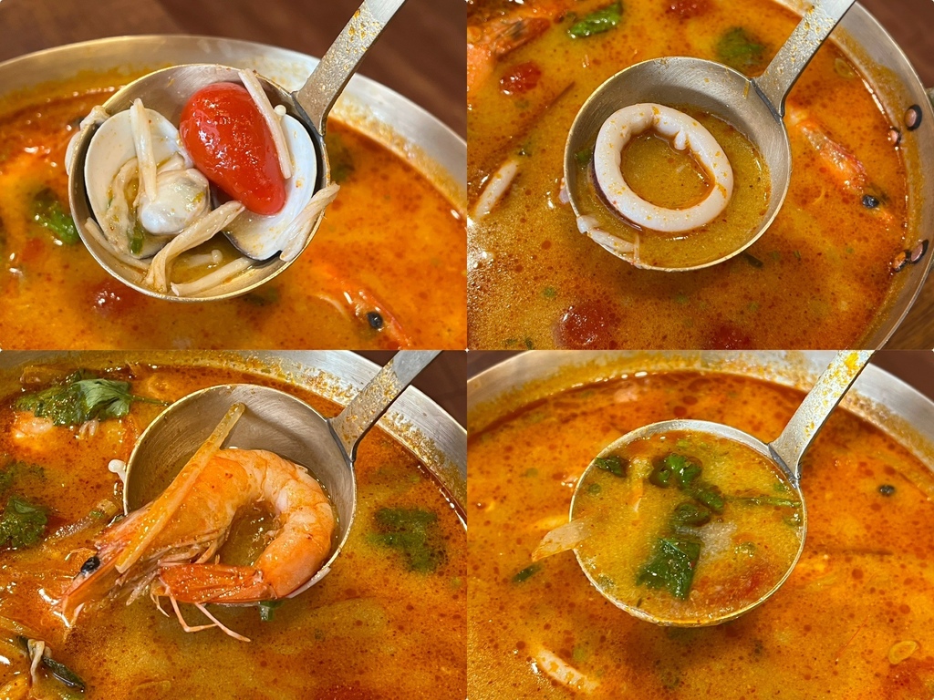 泰式海鮮酸辣湯頭味道一級棒!使用新鮮的進口泰式香料,湯頭的滋味特別濃厚,辣中帶點甜酸,越喝越有食慾