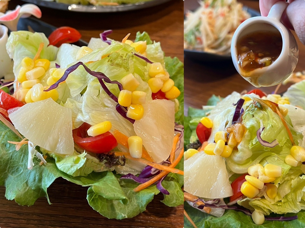 一旁還有附上清爽的生菜沙拉,淋上沙拉醬攪拌均勻,可以除去食物的油膩感,吃外食的同時也能補充滿滿纖維素,