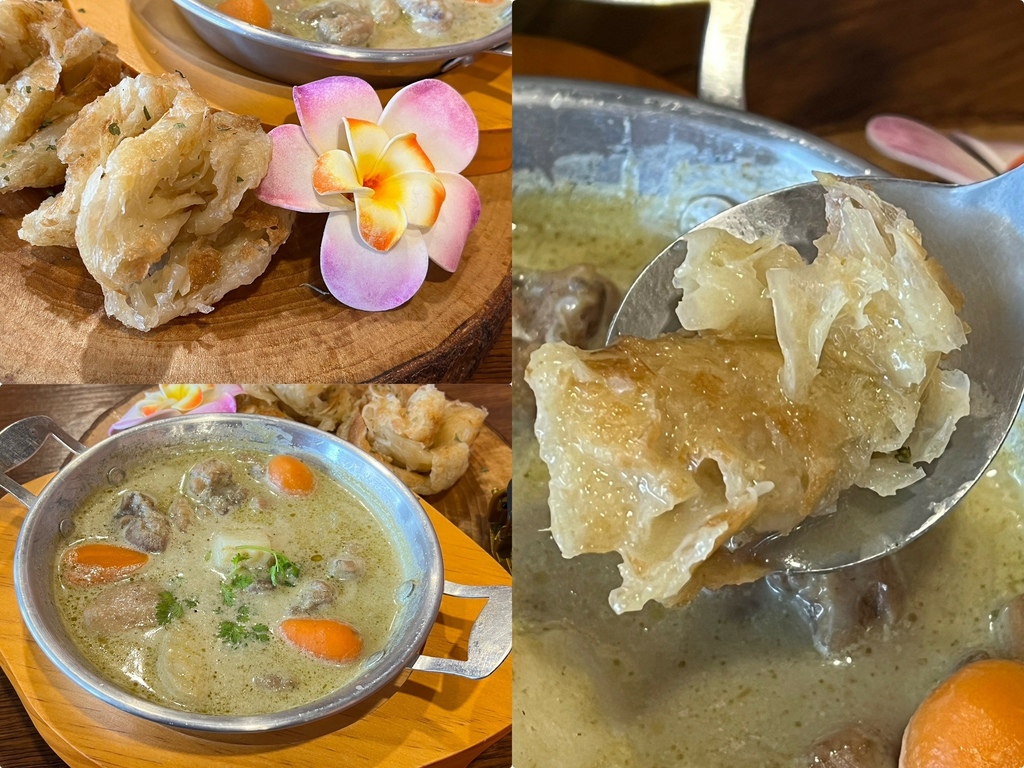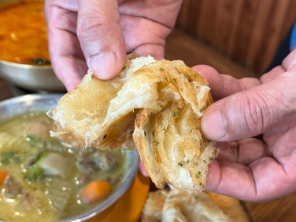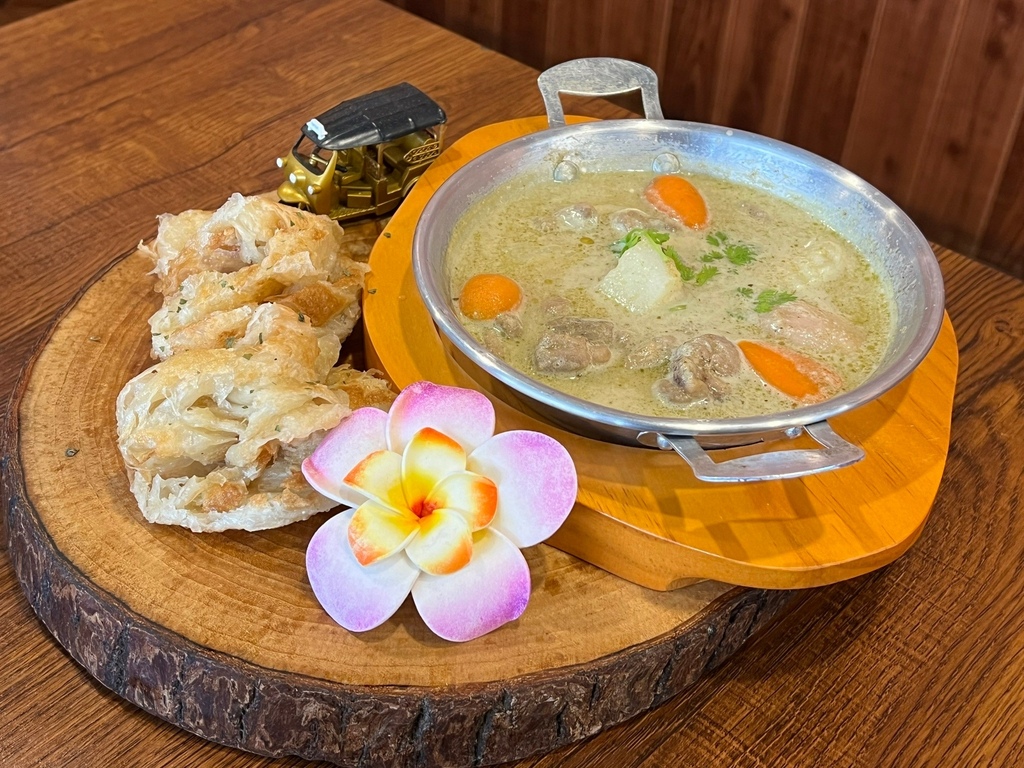 拉餅表面非常酥脆,質地非常有Q勁,浸泡在綠咖醬汁裏頭,一口咬下湧出綠咖哩香氣,隨即充滿口腔每個角落,真的太好吃了