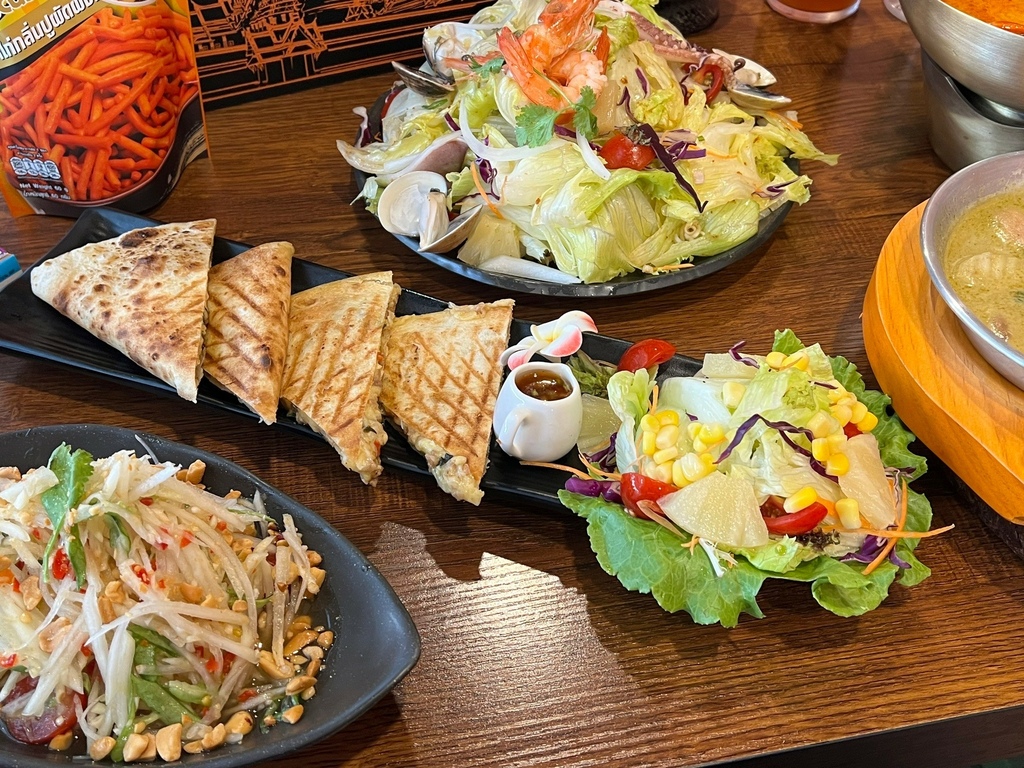 餐點相當有創意,海鮮拌泡麵用料超多又新鮮、香濃的綠咖哩雞肉拉餅、新推出的嘎拋豬起司烤餅,每一道都好好喔,份量十足吃得好飽