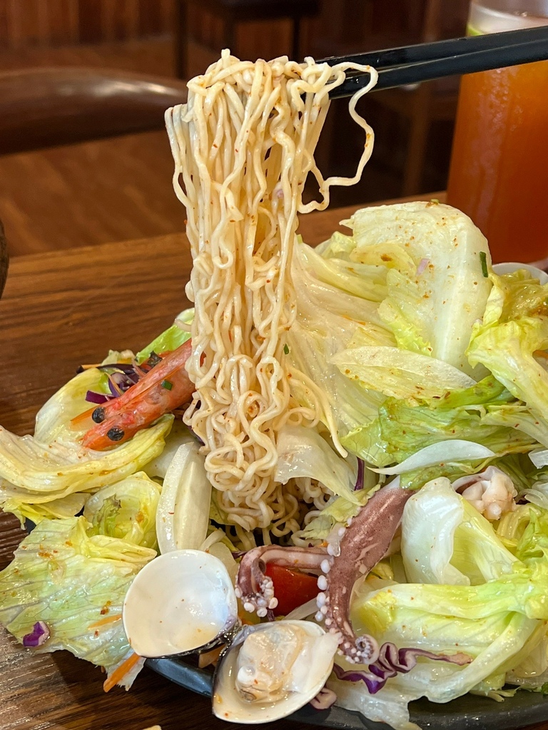 相當有創意的海鮮拌泡麵,超大一盤堆得跟小山一樣高高的,是道非常清爽的主食選擇,很推薦吃膩便當的朋友,來泰之初換換口味~