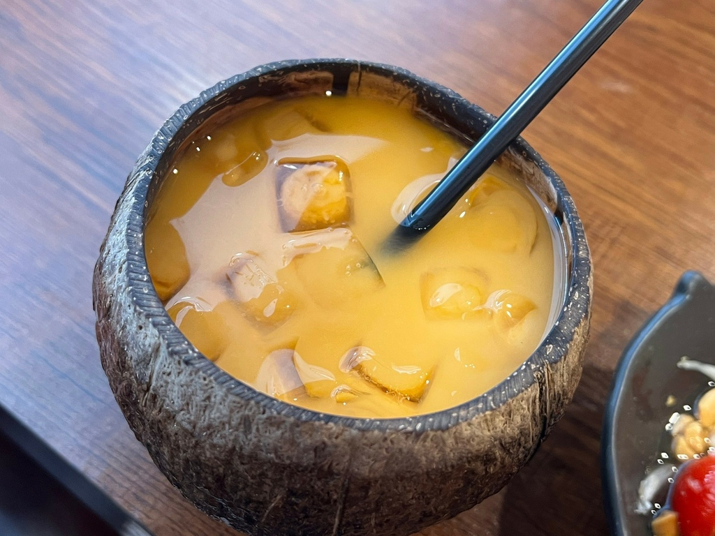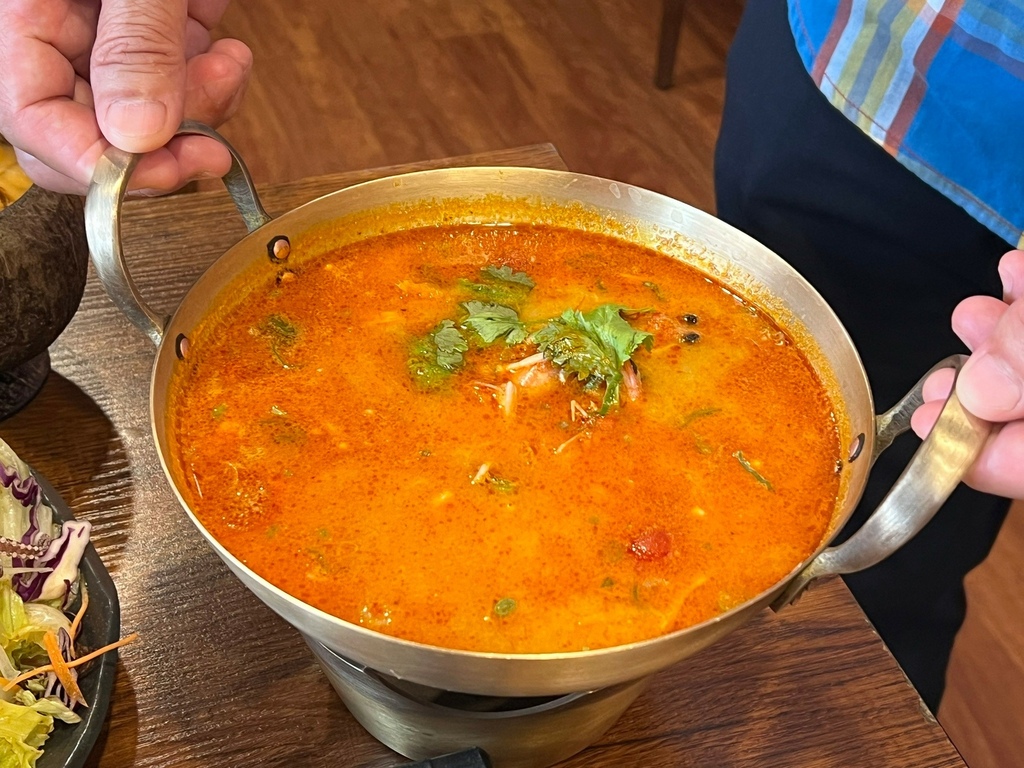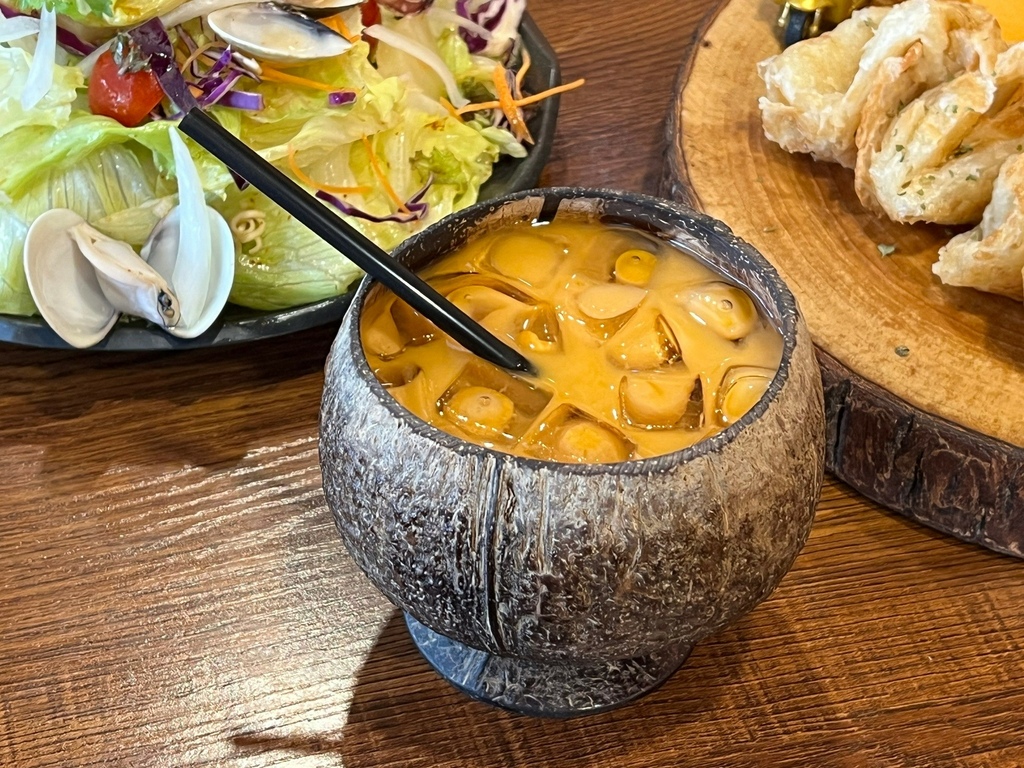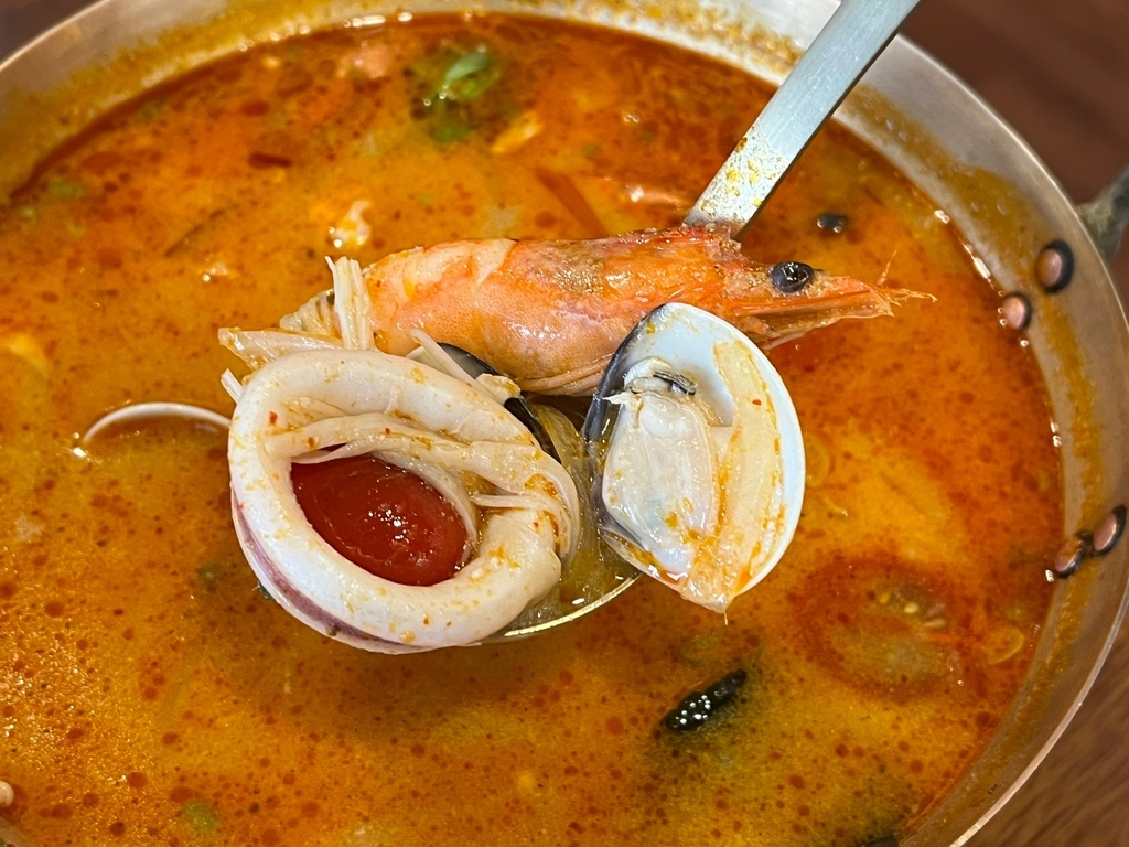 我朋友一個人就可以喝下一大鍋,裏頭的花枝、蛤蜊、大蝦,通通都超新鮮,湯頭充滿海鮮的鮮味,是來泰之初一定要點的湯品