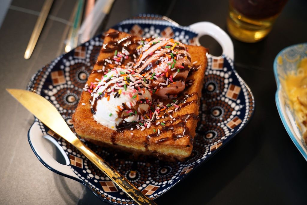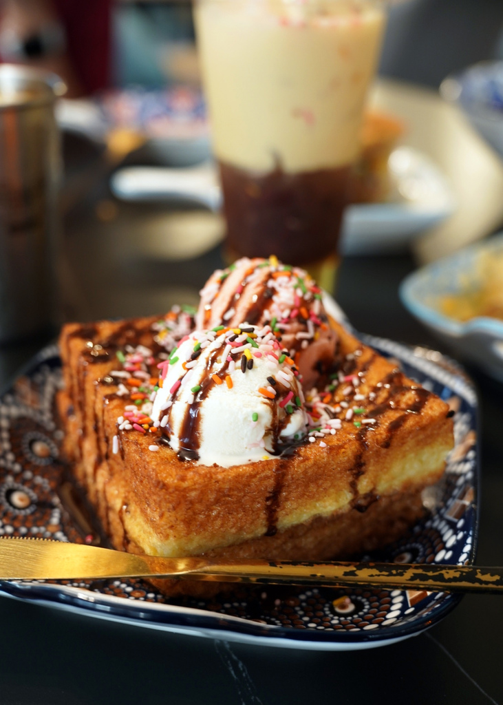 西多士金黃可口~冰淇淋冰冰涼涼的,搭配熱呼呼的西多士,口感超特別。甜滋滋的滋味,甜而不膩,吃起來一點都不會覺得負擔,Emma也超愛,一直要再來一口呢!
